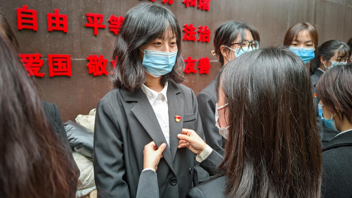 走出博物馆,同志们面向大写的“精忠报国”举起右拳许下铮铮誓言。随后举行老党员为新党员佩戴党徽仪式,一枚党徽传递着党员的责任和担当,鞭策着新党员牢记入党誓词,听党话、跟党走,不负胸前的闪耀。
