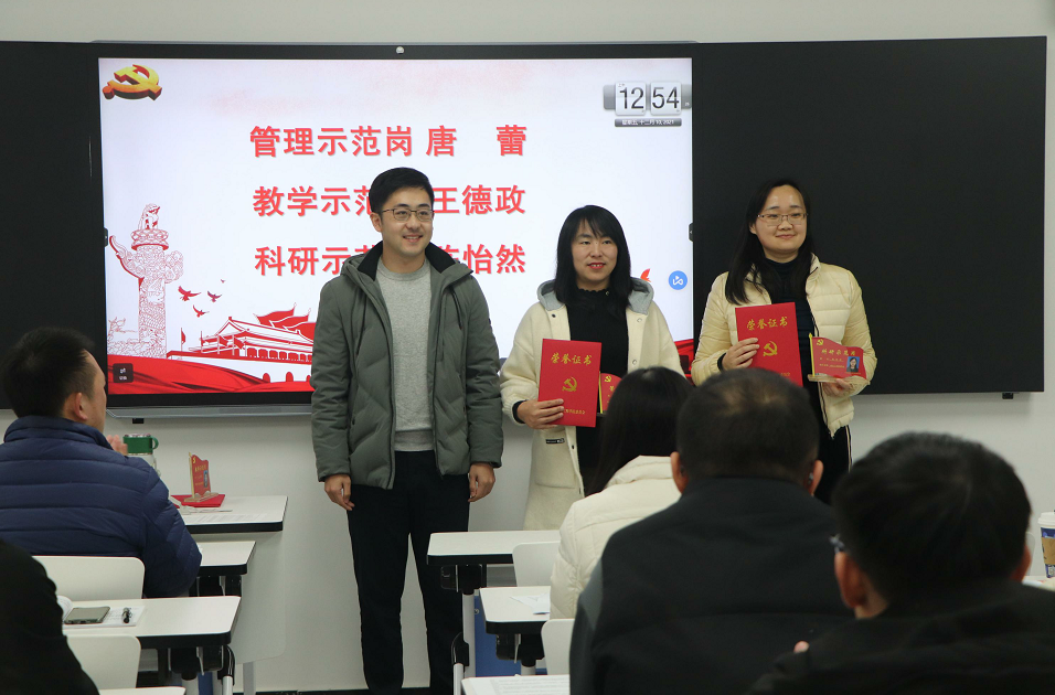 第一项议程为教学示范岗、管理示范岗、科研示范岗颁奖仪式。首先,尚伟分别对唐蕾、王德政和陈怡然进行颁奖,在场人员对此表示热烈的祝贺。随后,尚伟讲到,希望各位在场同志向获奖同志看齐并以他们为榜样,学习他们对工作的极其认真、对生活的无限热枕的精神。最后,尚伟表示,相信各位在场同志能够在打造自己的同时也带领学院不断进步,努力塑造一个更加积极向上的团队,在未来一起共创辉煌。