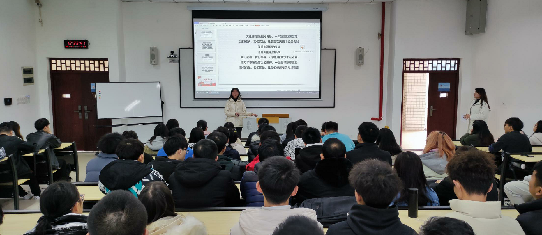 “火红的党旗迎风飞扬,一声宣言唤醒苦难,我们成长,我们实践,让羽翼在风雨中经受考验仰望你矫健的英姿......”伴随着嘹亮的歌声,铿锵有力的节奏,全体同学在左春莲同学的带领下一同歌唱《党员先锋之歌》。歌词铿锵有力,激励每一位同学奋发向上。