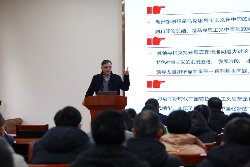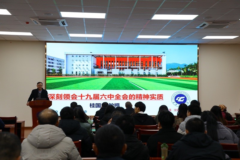 党的十九届六中全会,是在我们党成立一百周年的重要历史时刻,在党和人民胜利实现第一个百年奋斗目标、全面建成小康社会,正在向着全面建成社会主义现代化强国的第二个百年奋斗目标迈进的重大历史关头召开的重要会议,在党的历史上具有重要的里程碑意义。为深入学习贯彻党的十九届六中全会精神,根据学习教育活动安排,2022年1月5日,学校党委委员校长桂国庆在办公楼201会议室为计算机与物联网学院全体教职工和学生党员宣讲党的十九届六中全会精神。