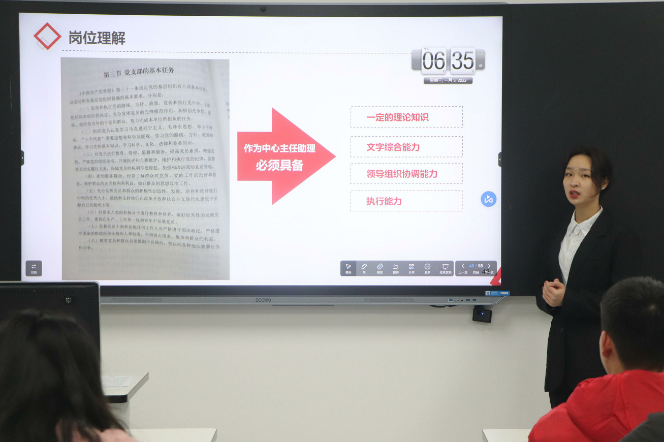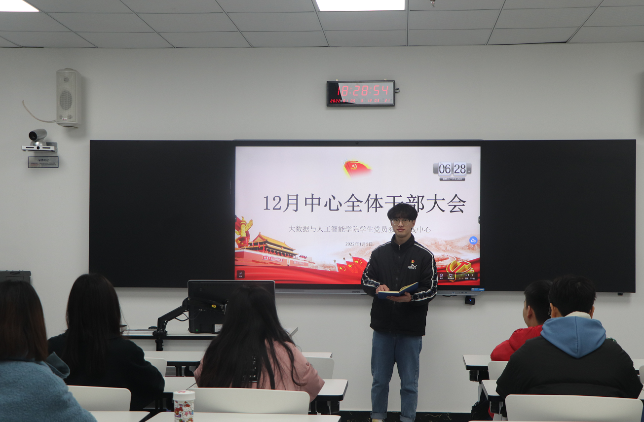 为补充学院学生党员实践教育中心新鲜血液,进一步推动学生党员实践教育中心的创新发展,,激励全体中心干部肩负起新时代的职责和使命。2022年1月5日下午,大数据与人工智能学院学生党员实践教育中心在7206召开12月干部竞聘大会,参加本次会议的有党员实践教育中心全体干部,学院组织兼统战委员蔡丽参加。