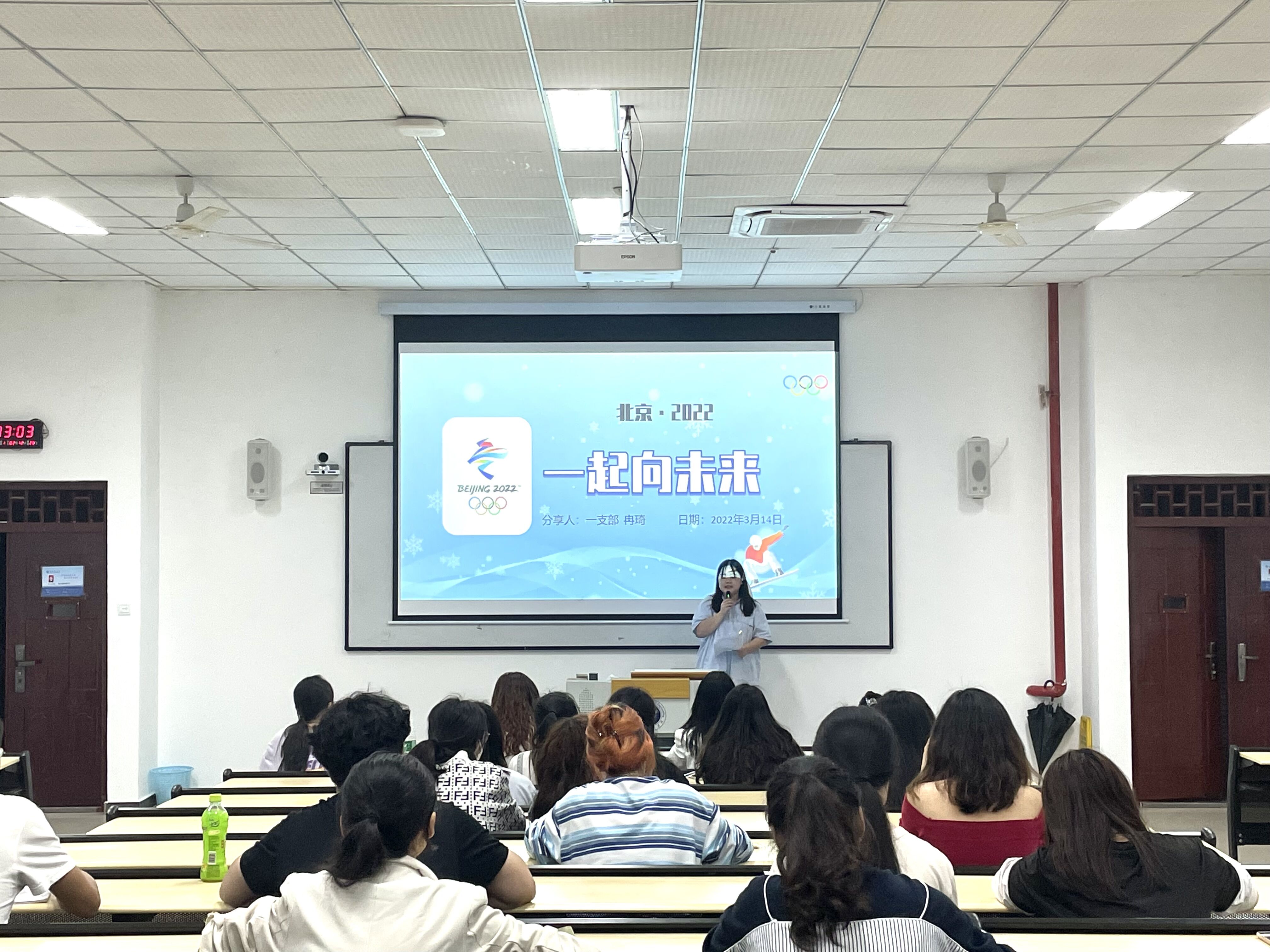 活动开始,冉琦同志为同学们详细地讲解了冬季奥林匹克运动会的发展史,包括其成立的时间、地点、人物和意义。然后,她从7个大项、15个分项、109个小项介绍了2022年北京冬奥会赛事项目。除此,在北京冬奥会中,会徽“冬梦”、吉祥物“冰墩墩”、火炬“飞扬”和跳台滑雪场地“雪如意”等极具中国韵味。奥运健将——挑战自我的谷爱凌、追求卓越的羽生结弦和永不放弃的李玟仪,同学们从他们身上能够深刻地体会到奥林匹克精神。随后,曾莉娟同志从5G时代和举国抗疫两个方面介绍新中国从1949年到2022年的发展史,将新中国的发展历程用71个标志性词语表现出来,呈现出了一幅谋求发展、不懈奋斗的生动画卷。