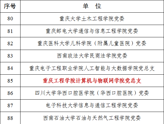 第三批“全国党建工作标杆院系”培育创建单位名单一共公布了100个院系,重庆有六所高校院系入选该名单,我校计算机与物联网学院党总支为唯一入选的重庆市民办高校。