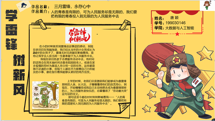 为深入贯彻落实习近平总书记关于传承和弘扬雷锋精神的系列重要论述,培养同学关爱他人、服务社会的优良品质。2022年3月14日至2022年3月20日,大数据与人工智能学院学生党员实践教育中心开展了“弘扬雷锋精神”主题活动。参于此次活动的有全院学生党员、发展对象以及入党积极分子。