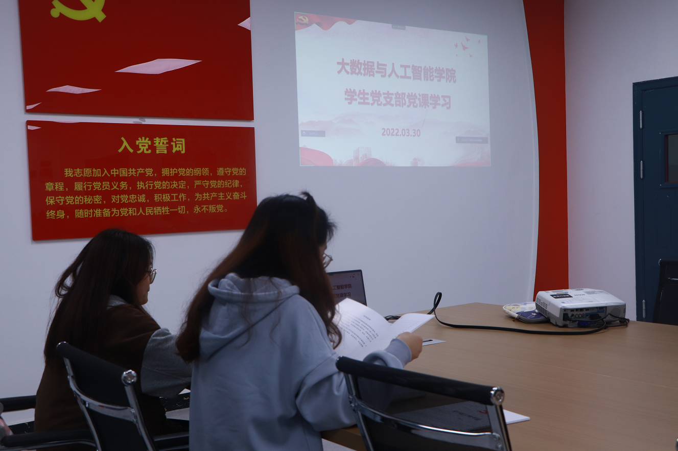 为了提高学生党员的政治理论水平,进一步增强“四个意识”,坚定“四个自信”,做到“两个维护”,2022年3月30日,大数据与人工智能学院学生党支部在7205组织开展党课学习。参与本次学习的有学生党支部书记蔡丽同志以及支部所有学生党员。