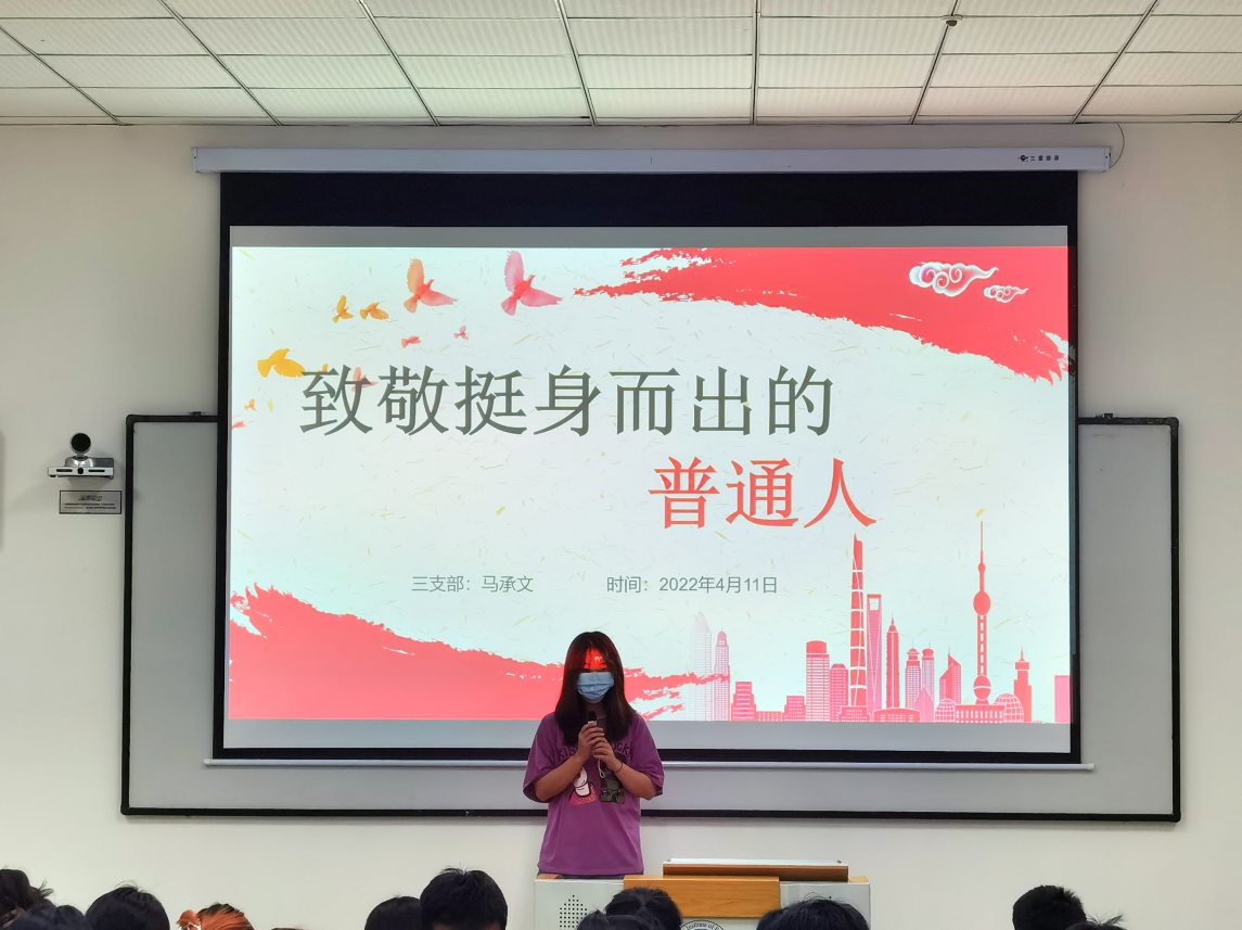 活动伊始,学生第三党支部的马承文同学以“致敬挺身而出的普通人”为题,围绕逆行者、人民英雄等关键词,讲述了挺身而出的普通人的故事。在火场中为营救被困群众而不幸英勇牺牲的消防员欧保尔、韦吉德,将青春的身影定格成了冲锋的姿态;在“8·12天津滨海新区爆炸事故”中全部壮烈牺牲的天津港消防支队五大队,将他们的生命定格在了漫天火光中。还有永不坠落的扶贫志吴国良、冲锋陷阵的“瘦弱将军”肖云峰、“一封群众的请愿书”高克强......他们在平凡的岗位上铸就了生命的精彩华章,擦亮了道德星空,树起了时代标杆,挺直了民族脊梁。时政热点分享环节,同学们各抒己见,积极参与到讨论当中。跪地做心肺复苏连救3人的重庆女医生,让同学们感受到了英雄不过是普通人的挺身而出。“动态清零”总方针,让同学们明白了疫情形势依然严峻复杂,遵守防疫抗疫要求是每一个人的义务与责任。