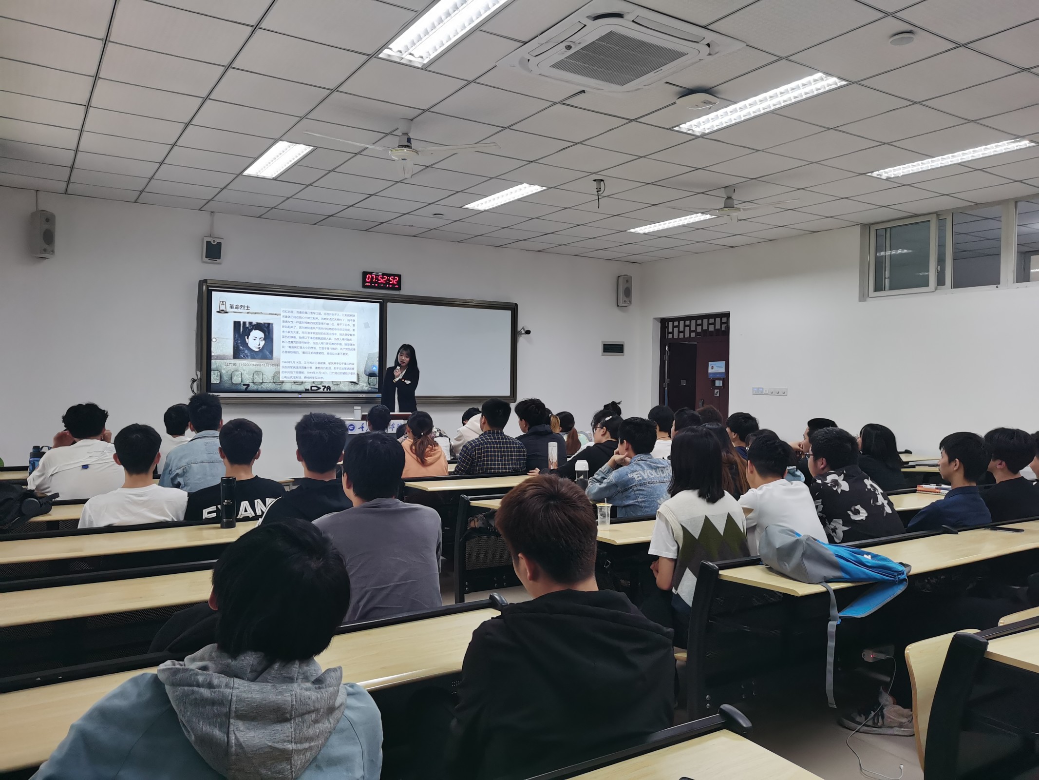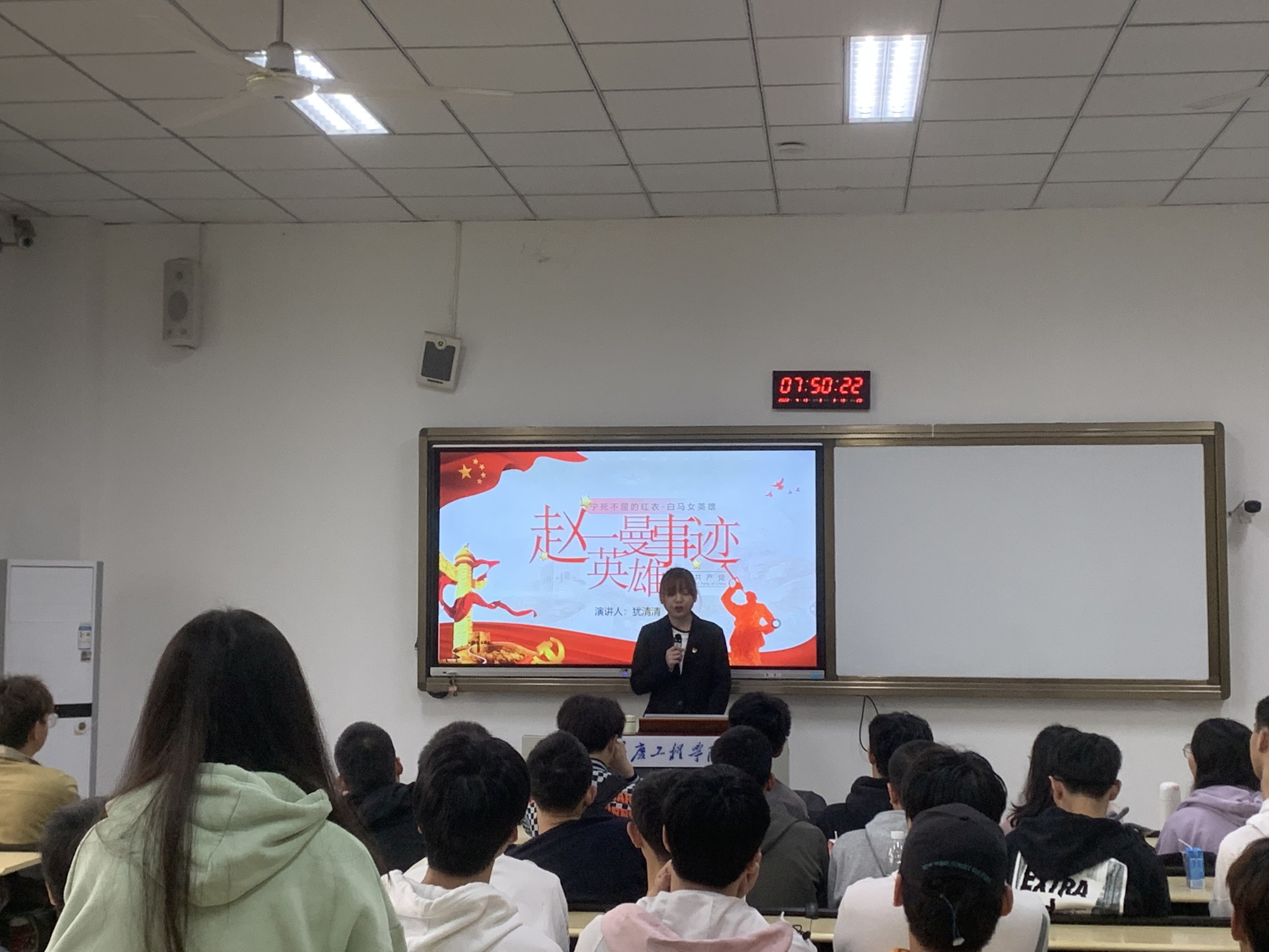 彭鑫一、陈首红、犹清清、廖华4位学生党员同志围绕本月党日活动主题“缅怀英雄先烈,弘扬革命精神”,生动形象地向2020级同学们讲述了赵一曼、江雪琴等革命先烈们的英勇事迹。