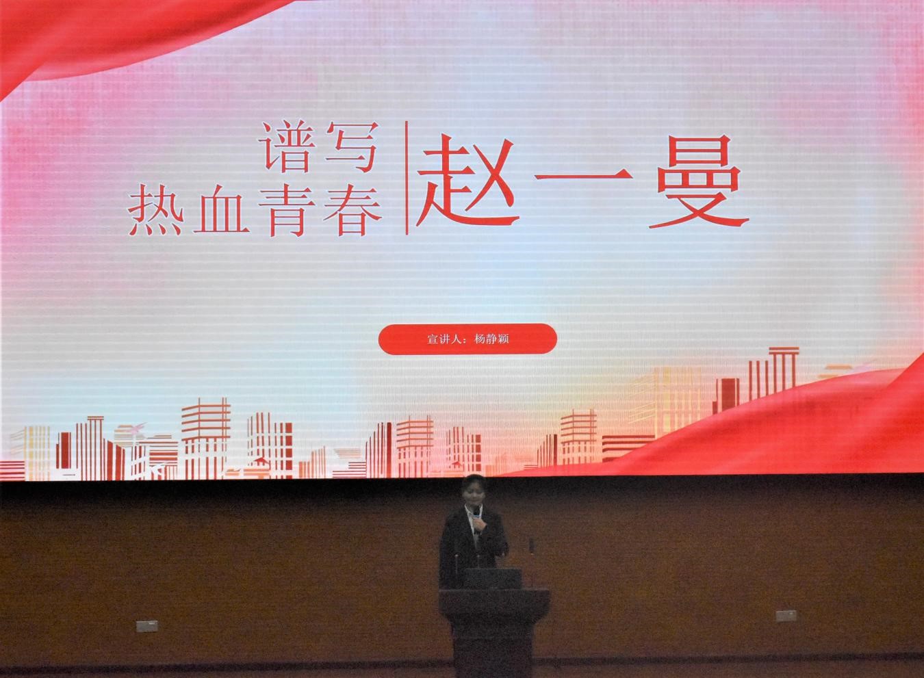 由一段壮烈的奋斗年代视频将同志们带入宣讲中。宣讲员通过讲述,赵一曼的“为惜头颅新故国,甘将热血沃中华”、董存瑞的“天地英雄气,千秋尚凛然”、陈延年的“宁作站死人,不做跪死狗”的,让人感叹不屈的抗争精神;大山的教师张桂梅,怀有禾下乘凉梦与杂交水稻覆盖全球的梦想的袁隆平老先生,让同学们知道了什么是真正的“侠之大者,为国为民”。王一寰同志对“何为青年”的宣讲将宣讲会带入高潮,诠释了青年是救国图存,为祖国建设而不断努力奋斗,永远充满着朝气与活力的群体。随后,红色文化团集体朗诵《我们正年轻》,让人热血沸腾,极大的激起了同学们内心的爱国情怀。