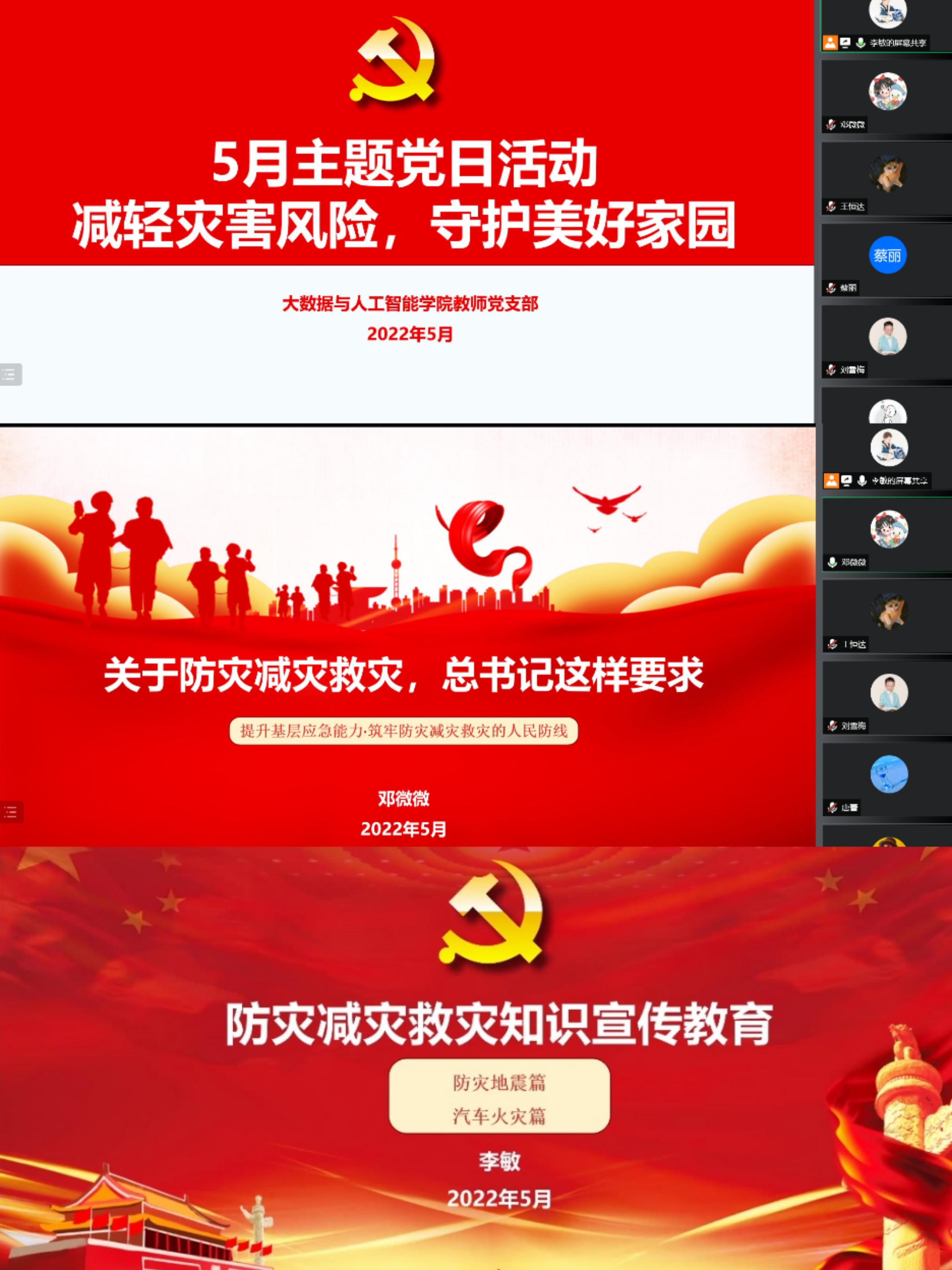 为切实增强党员的防灾减灾意识,践行我国第14个“5·12”防灾减灾日的主题思想,2022年5月30日下午,大数据学院教师党支部在腾讯会议线上开展 “减轻灾害风险,守护美好家园”专题教育。活动由教师支部书记李敏主持,学院全体教师党员参加。活动包括关于防灾减灾救灾总书记这样要求、防灾减灾救灾知识宣传教育和分享交流三个环节。