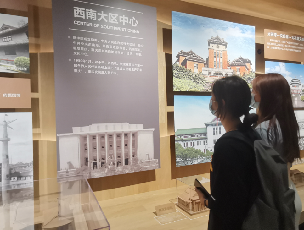 重庆市规划展览馆位于南岸区南滨路弹子石广场,利用既有车库更新改造而成,建筑总体呈现“起”字意向,寓意起风景、起征程的奋起之义。在讲解员的讲解带领下,大家依次参观了“序厅”“自然山水”“历史文化名城”“总体规划”“高质量发展”、“高品质生活” “内陆开放高地”“山清水秀美丽之地”8个室内主题展区。展览馆充分使用现代高科技手段,通过平面展板、多媒体屏幕、互动平台等多种形式,展示了重庆的人文典故、悠久历史、古典建筑、物产特产、交通变化、城市发展等,同学们通过触摸屏幕与伟大的革命先烈进行了“近距离”的对话。