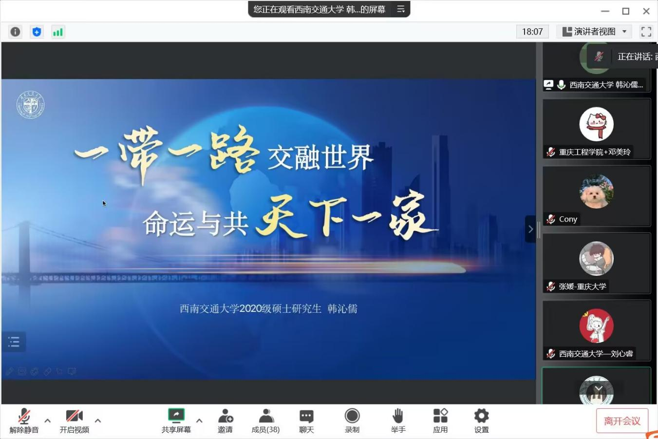 (文/图 软件与人工智能学院 李佳玲)为迎接党的二十大胜利召开,深入学习贯彻习近平新时代中国特色社会主义思想,加强西南地区学生理论宣讲团交流,10月15日,重庆大学“树声”理论宣讲团联合西南交通大学研究生“红路”理论学讲团开展西南地区高校学生宣讲团线上交流活动,我校软件与人工智能学院“云智”宣讲团及电子科技大学、重庆大学等11所高校宣讲团队参与交流。