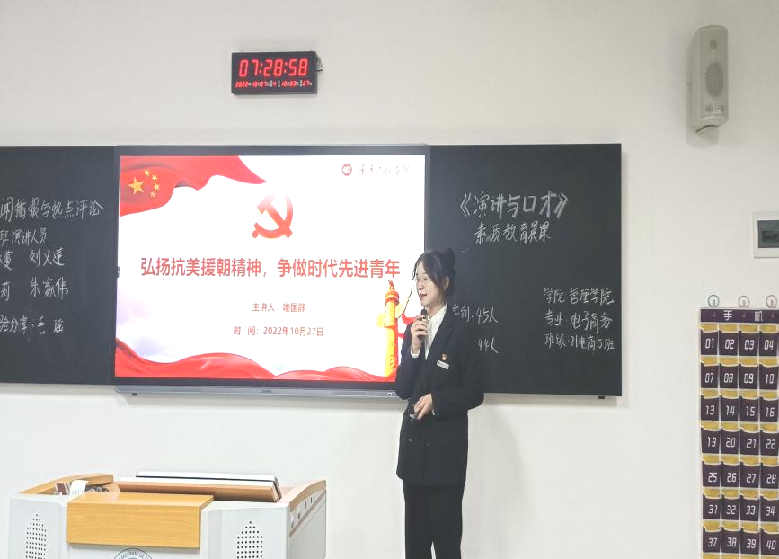 (文/图 管理学院 邹学微)为铭记革命先烈,传承抗美援朝精神,2022年10月27日,管理学院党总支在第六教学楼开展了“大学生微党课”进班级活动。9名学生预备党员走进晨课教室,向2021级同学们进行了“承抗美援朝精神,做时代先进青年”主题宣讲。