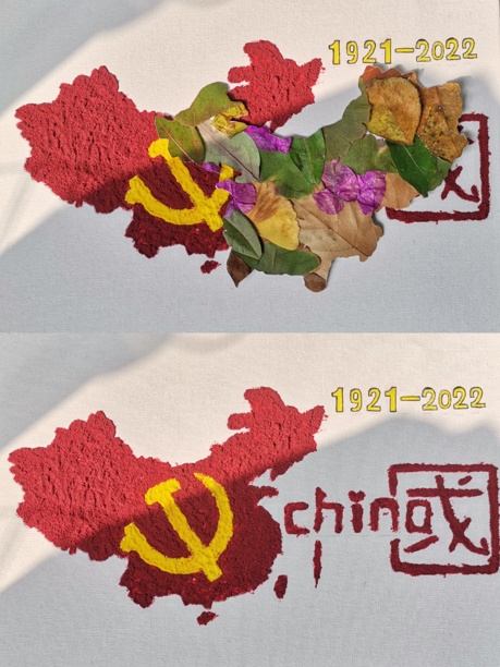 活动中,大家全程佩戴口罩,隔位就坐。此次作品展示,共有5个小组参与。其中“深藏blue队”先是用飘零的落叶堆积拼接成祖国曾经的样子,接着用石英砂和丙烯颜料混合成的中国红描绘出了祖国的广袤大地;这幅作品象征着在中国共产党的带领下,曾经满目疮痍的祖国如今熠熠闪耀。