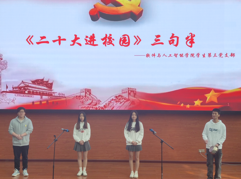 本网讯(文/王瑞浩 图/软件与人工智能学院)为认真学习贯彻党的二十大精神,继承和发扬党的优良传统和作风,11月27日,软件与人工智能学院党总支在信息大楼报告厅举行“悟思想·聚力量”学习党的二十大精神汇报演出。