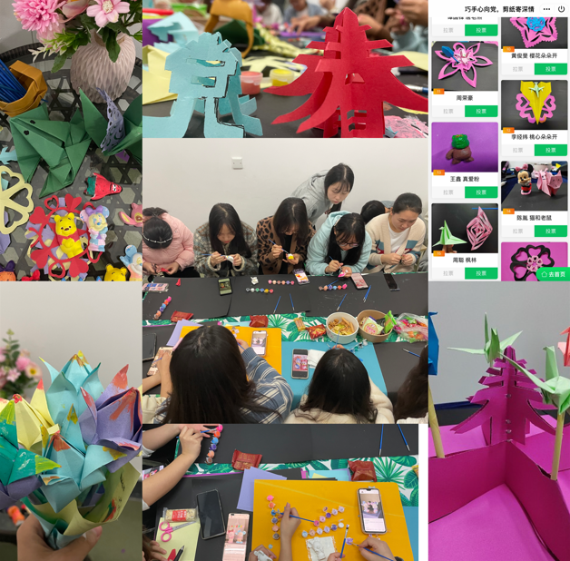 活动伊始,同学们通过剪纸、折纸,让鲜艳的彩纸在手中折叠、翻转,将吉祥、希望和祝福融于指尖。紧接着,大家用剪刀裁剪出层叠的窗花、镂空的文字和吉祥的图案等丰富的创意作品。室内方寸之间,同学们热火朝天地忙活着,大家用一把小剪刀细细打磨着自己的作品。在大家的共同努力下,一件件栩栩如生的作品,焕发着别样的风采,饱含着同学们对党和国家的祝福。活动最后,同学们将亲手制作的作品进行了展示、互评,形形色色的作品精巧而富有生活气息,寄托着同学们的美好祝愿。