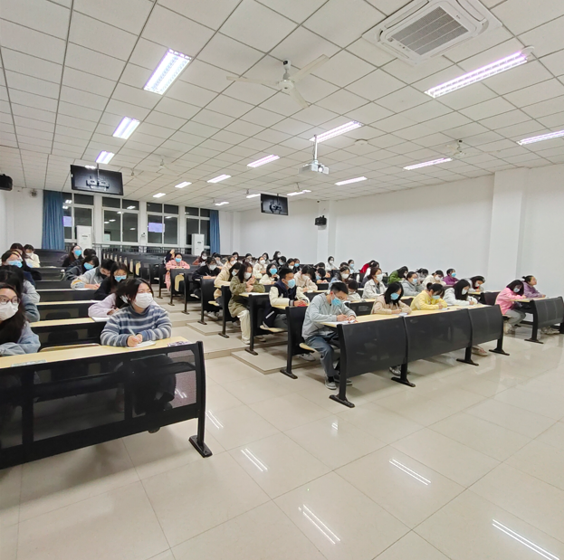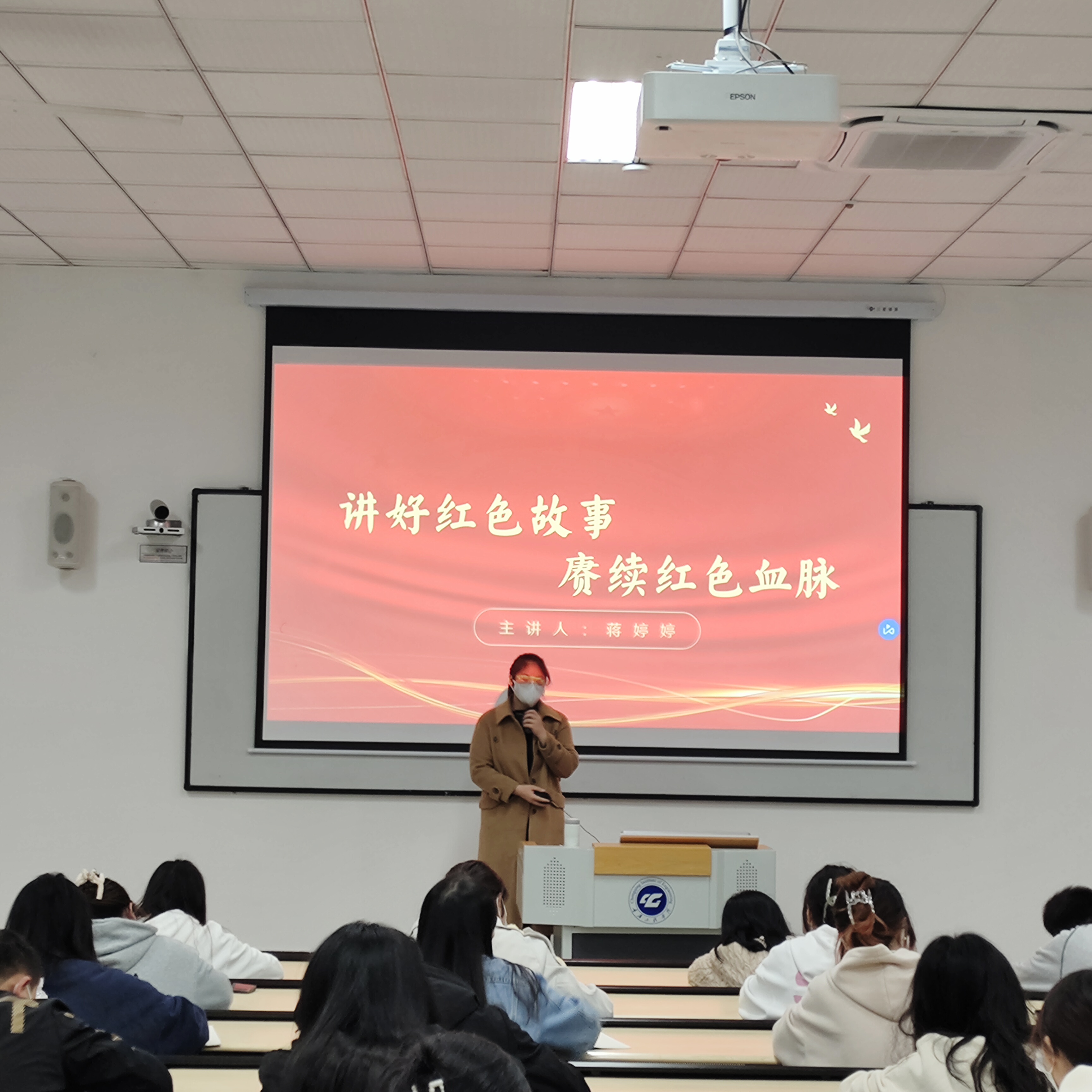 活动中,大家全程佩戴口罩,隔位就坐。蒋婷婷同学进行了“讲好红色故事 赓续红色血脉”主题分享,她分享了红色经典故事,并结合当下讲述了来自各行各业的先锋模范的事迹,号召同学们弘扬革命精神,争当时代好青年。