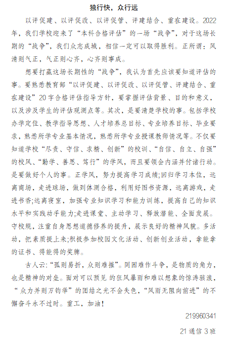“业精于勤而荒于嬉,行成于思而毁于随。”通过本次征文活动,使同学们深刻理解评估指标体系和各级指标的内涵、要求,了解评建的步骤与进程,处理好评估工作与日常工作的关系,形成人人了解评估、人人关心评估、人人参加评估、人人为评估做贡献的良好氛围。作为学生应当尽职尽责,认真学习评估知识,充满学习的热情和信心,弘扬“崇德尚能,行知合一”的校训,与学院一同迎接评建考核,为顺利通过合格评估贡献自己的力量。