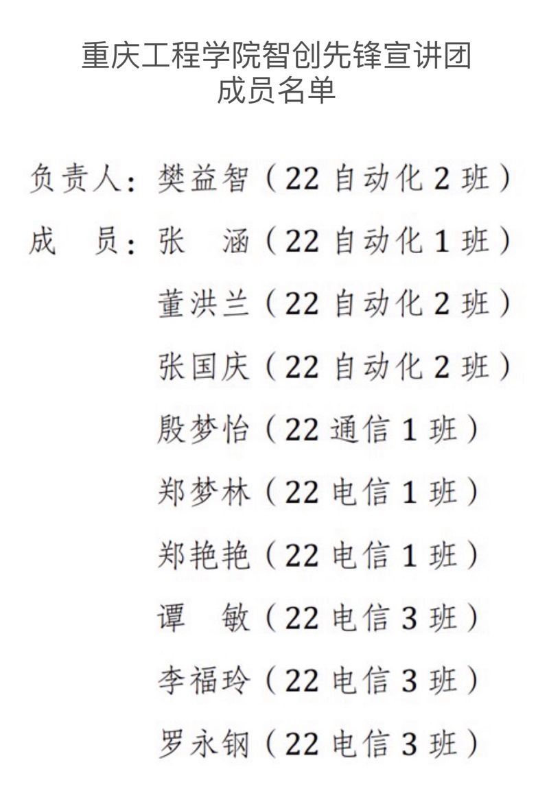 乡村振兴,青年先行。重庆工程学院智创先锋宣讲团是由重庆工程学院智能制造学院党总支具体组建管理、电子信息学院党总支协助指导的宣讲志愿服务队伍。团队成员为自动化、电子信息工程、通信工程等专业学生。宣讲团以“乡村振兴承厚志,青年接力逢其时”为口号,旨在通过实际行动让更多人参与贯彻落实乡村振兴战略,以青年之力谱写新时代乡村振兴新篇章。