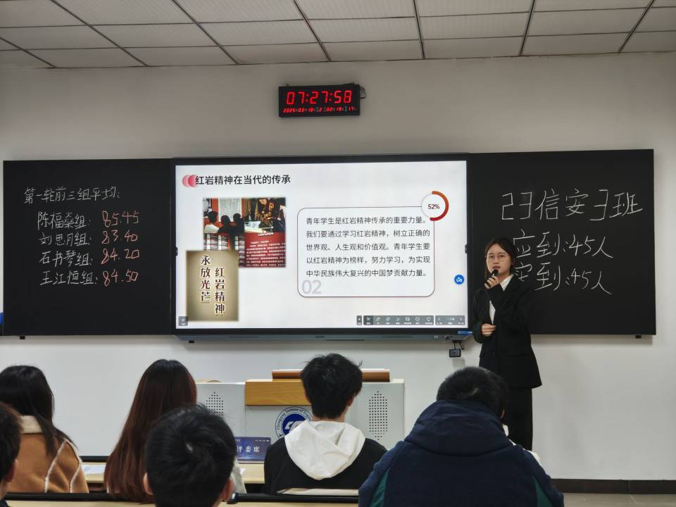 课上,14名党员学长围绕《红岩精神,时代先锋的力量源泉》这一主题,生动讲述了江竹筠等革命先烈在至暗时刻坚守理想信念的崇高事迹,强调红岩精神是党光辉历程的见证,是民族精神的重要组成部分,他们用青春话语诠释信仰力量,呼吁同学们坚定理想信念,勇担时代重任。最后,辅导员勉励学生们关注并记录身边那些传承红色基因的点滴善举,把理论学习的成果切实转化为日常的具体实践。