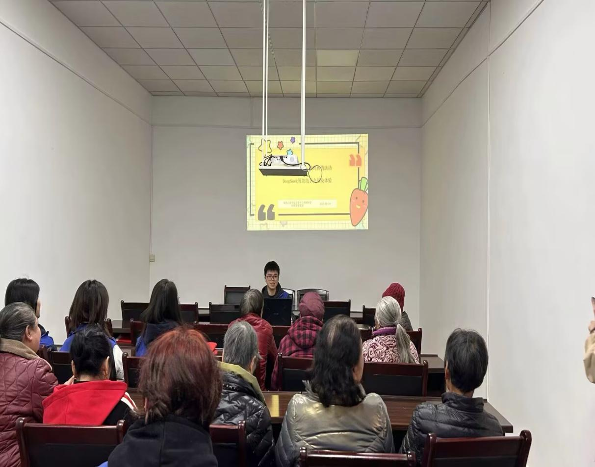 在首场Deepseek科普讲堂中,20名银发学员佩戴老花镜认真记笔记的场景令人动容。志愿者们通过“场景模拟+实物演示”,生动展示了深度求索人工智能系统在医疗预约、生活缴费、应急求助等适老场景的应用。61岁的王阿姨兴奋地向邻居展示学习成果。课堂特设“银龄数字能力评估表”,为后续开展精准化服务建立数据库。