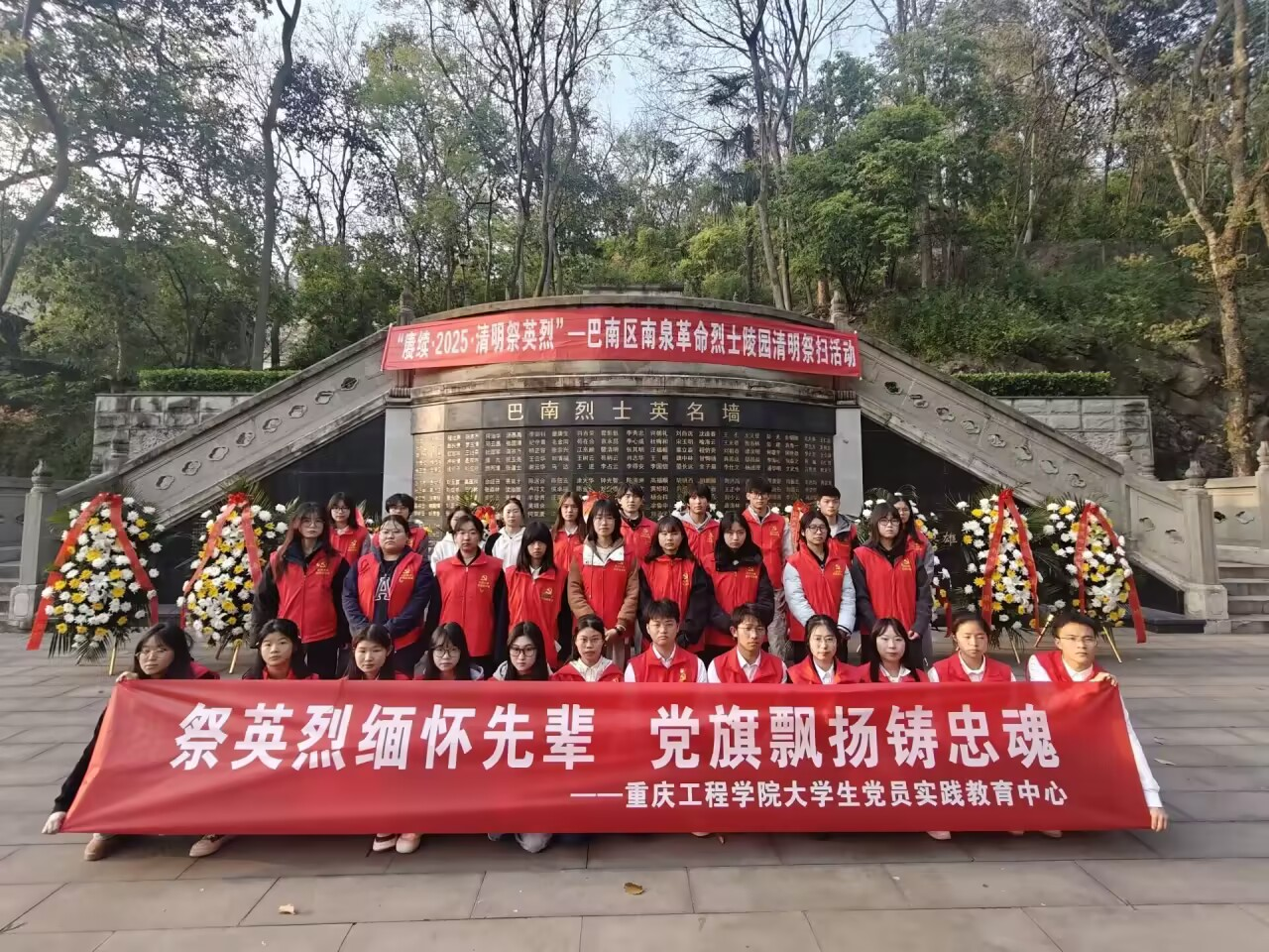 (本网讯 图/文 余守贞)为深入贯彻落实党的二十届三中全会精神,缅怀革命先烈的丰功伟绩,弘扬爱国主义精神,传承红色基因,重庆工程学院大学生党员实践教育中心于2025年4月2日在巴南区南泉烈士陵园开展了为“祭英烈缅怀先辈,党旗飘扬铸忠魂”的祭扫活动。此次活动由大学生党员实践教育中心和各二级学院分中心38人参与活动。
