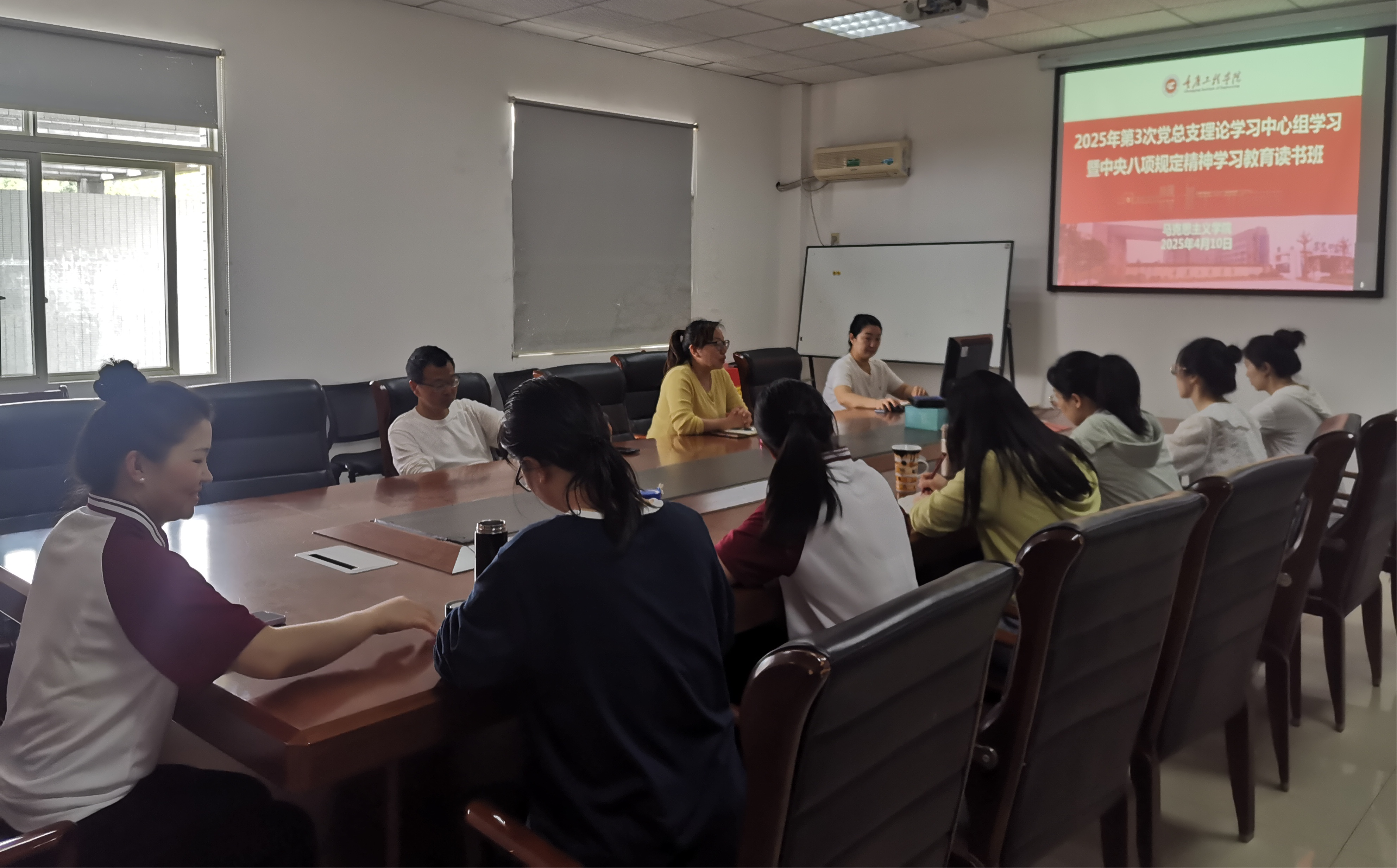 本网讯(文/图 刘爽)为深化党纪学习教育成果,落实中央八项规定精神,推进作风建设常态化长效化,4月10日,学院组织召开党总支2025年第3次理论学习中心组学习会议暨举办中央八项规定精神学习教育读书班。会议由党总支书记王巧玲主持,总支委员以及各支部书记、支部委员参加。