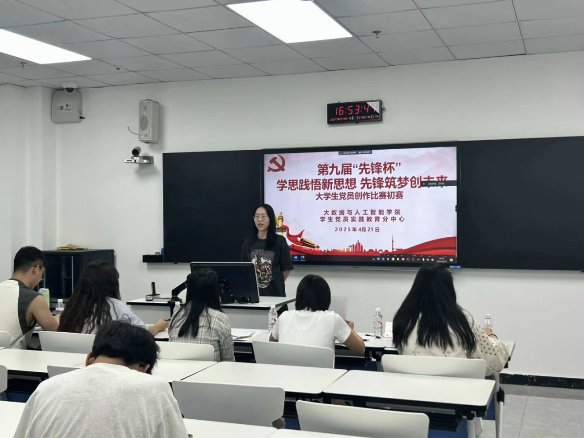 本网讯(文 /图 汪锶晨 彭永鑫) 为引导广大师生党员及党性积极分子深入学习贯彻习近平新时代中国特色社会主义思想,全面贯彻落实党的二十届三中全会精神,大数据与人工智能学院学生党员实践教育分中心于2025年4月21日在7教207举办了2025年“先锋杯”大学生党员创作比赛初赛。