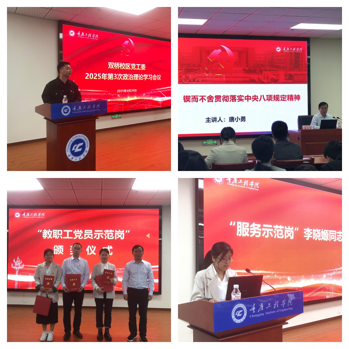 为贯彻落实新时代党的建设总要求,强化教职工思想政治建设与纪律作风教育,4月28日,中共重庆工程学院双桥校区工作委员会通过“理论学习+实践警示”双轨并行模式,组织开展2025年第三次全体教职工政治理论学习会议暨中央八项规定精神现场警示教育主题党日活动,为学校高质量发展注入强劲政治动力。