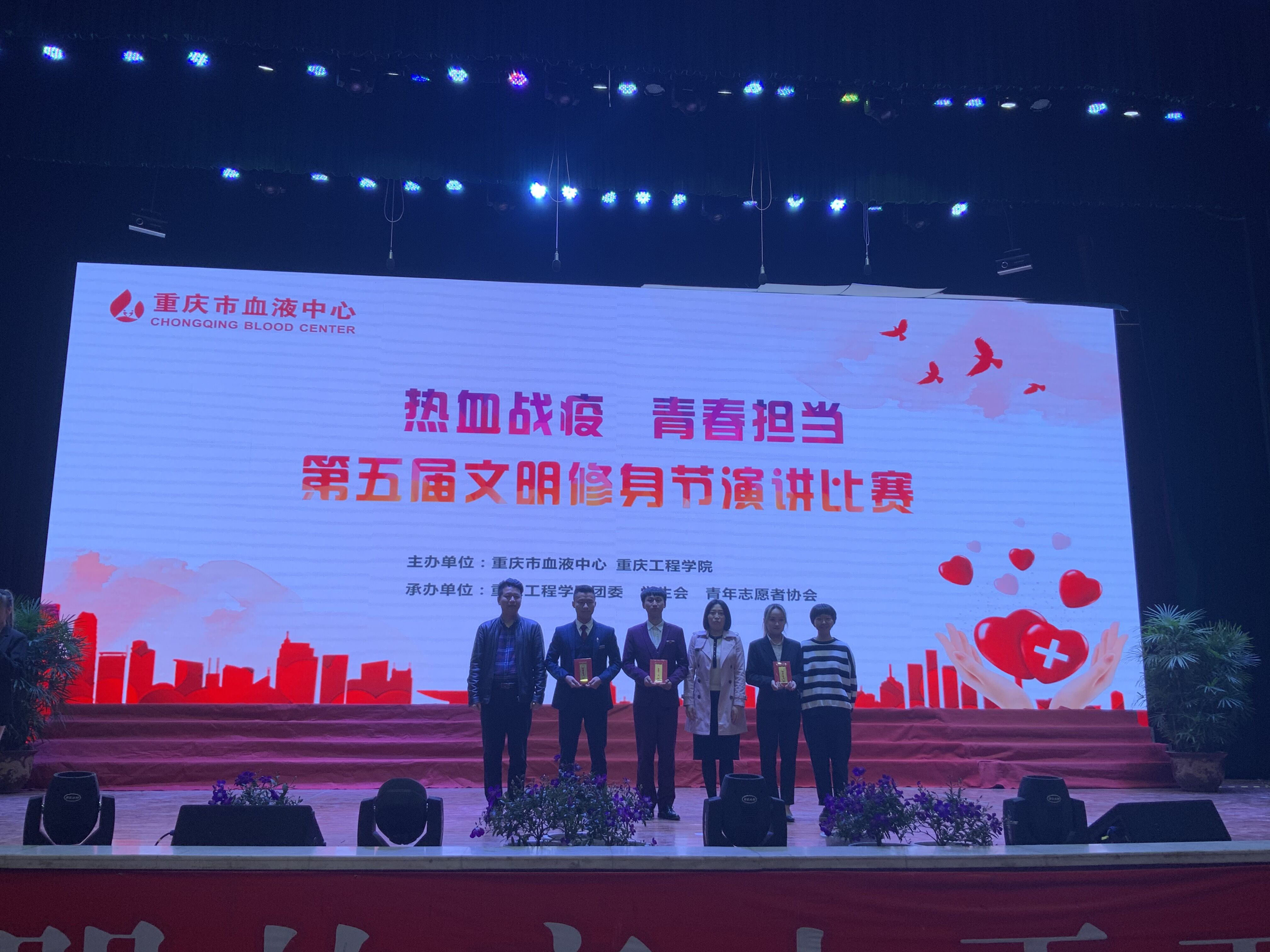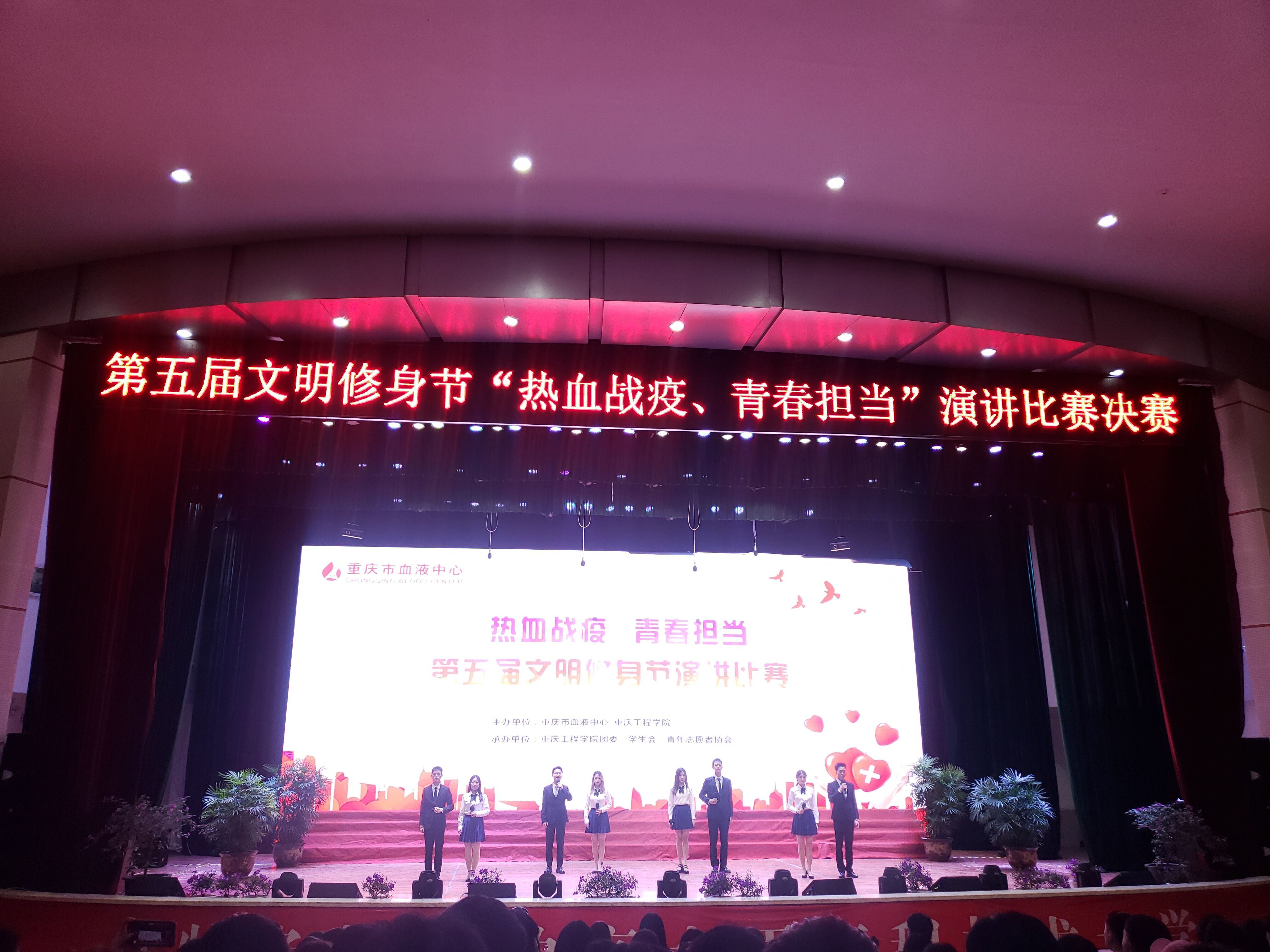 2020年11月18日晚上6:30,重庆工程学院第五届文明修身节“热血战疫、青春担当”演讲比赛在学术报告厅隆重举行。重庆市血液中心献血服务一科、社会事务科主任杨培、重庆市血液中心社会事务科杨茜受邀出席,校团委书记黄涛到场参与。本次大赛的评委由校团委指导老师彭璟及各二级学院推荐一名辅导员老师组成。