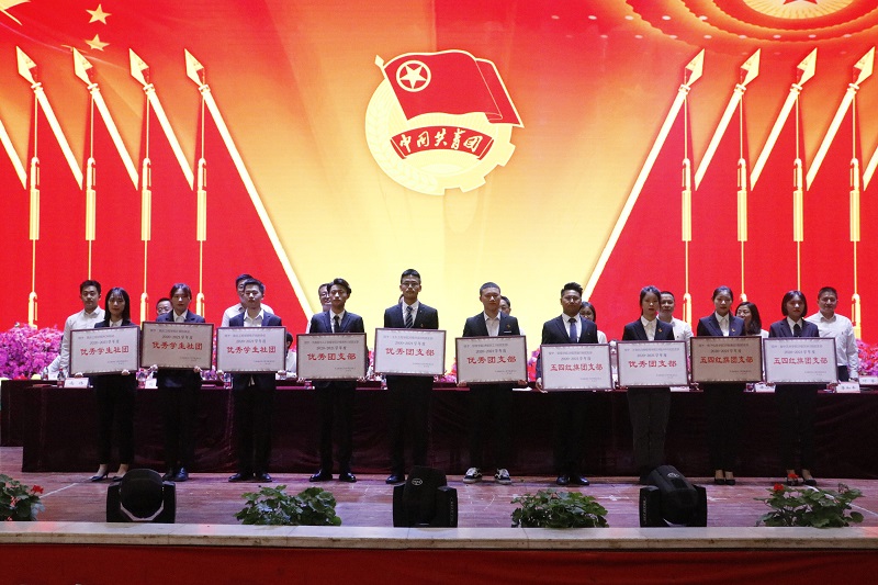 与会领导们依次为优秀共青团员、优秀共青团干部、优秀社团干部、五四红旗团支部、优秀团支部、优秀社团、市级以上获奖个人代表颁奖。优秀共青团干部代表朱健龙和五四红旗团支部代表张瀚瑶依次上台发言。