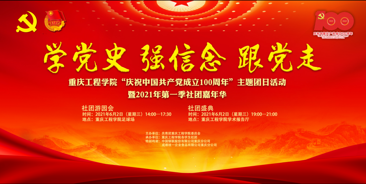 最后特别鸣谢中国银联股份有限公司重庆分公司、成都统一企业食品有限公司重庆分公司对此次活动的大力支持,预祝“庆祝中国共产党成立100周年主题团日活动暨2021社团嘉年华”圆满成功!