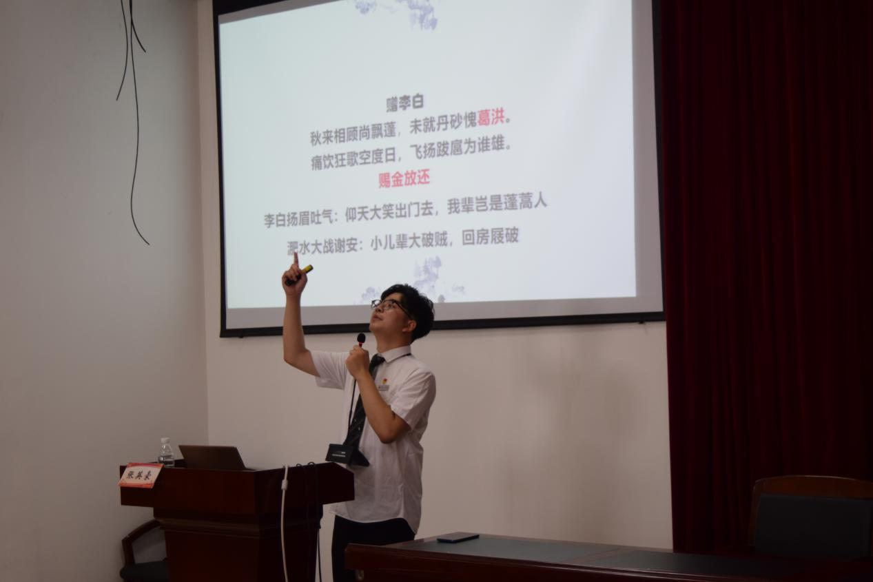 张英豪同学毕业于我校管理学院市场营销专业,现就职于南岸区残联,负责机关信息报送、回执等工作。曾荣获巴南区青年人才综合素质优秀奖、重庆市普通高校精神文明先进建设个人称号等奖项,发表文学作品《师记》、《登幽州台歌浅析》等收录于中国作家网,文章《中国古代儒法道三者关系》获得两江新区二等奖。讲座上,张英豪学长首先向同学们介绍了大学生应该如何学习文学,并结合杜甫所处的历史时代和杜甫诗词精选集为大家进行了剖析解读,他将杜甫短暂且伟大的一生通过凝练精彩的演讲展现在同学们面前,收获了大家的热烈掌声。