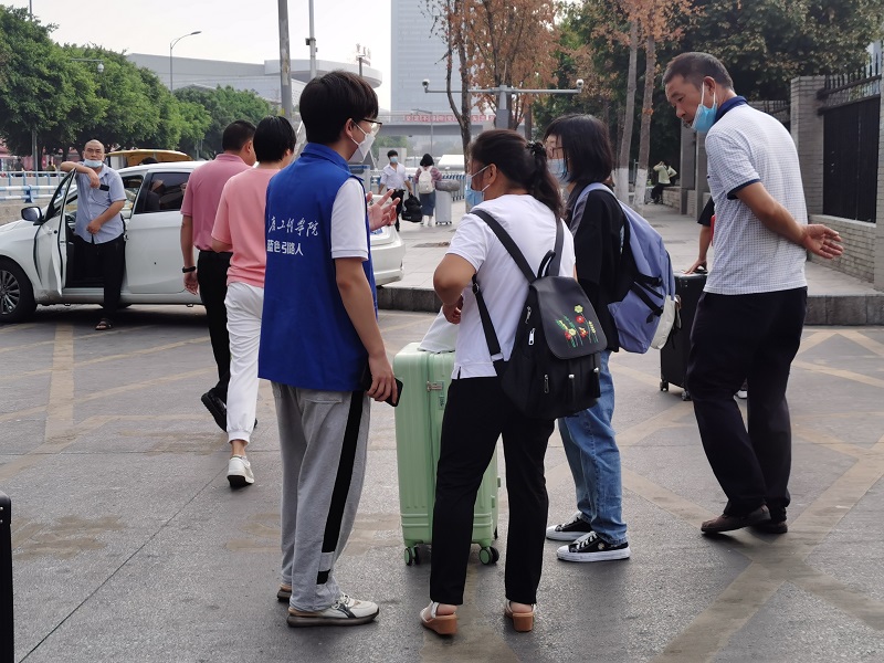 迎新工作最容易造成聚集的就是报到环节,而“蓝色引路人”们的工作就是尽可能快速地协助新生和老生完成各项报到流程,减少他们在报到处停留的时间。在人员相对集中的时段,秩序维护岗位的志愿者将新生进行有效分流,避免人员高密度集中,同时不停地提醒新生戴好口罩,保持间距。还有一些同学在志愿服务之余,主动帮助新生运送行李和物品,让他们感受到重工校园中的温暖,帮助他们迅速融入重工大家庭中。