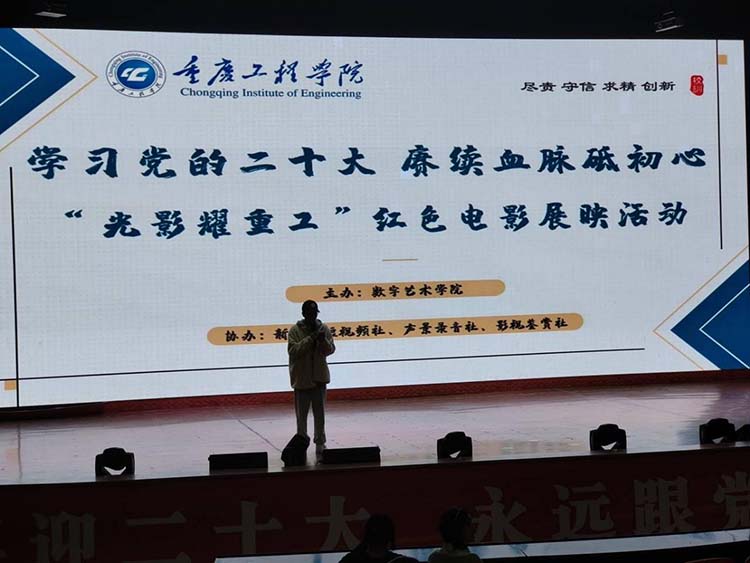 为了学习贯彻党的二十大重要讲话精神,强化同学们的精神品格。让红色电影映满校园,让同学们能够更加深刻地了解党史,珍惜现在的幸福生活。2022年11月12日晚19:00,重庆工程学院新媒体短视频社特联合声景录音社、影视鉴赏社在学术报告厅以及腾讯会议采用线上线下同步开展的形式举办了“学习党的二十大 赓续血脉砥初心‘光影耀重工’红色电影展映活动”,参加此次活动的共有550名同学。