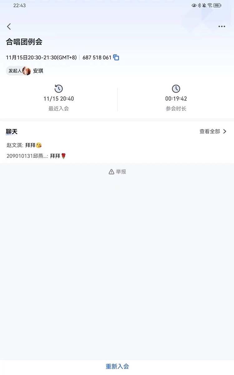 为更好开展后续工作,艺术团合唱团指导老师安琪老师与社团负责人邱燕玲,赵文淇,樊恒建,胡毅进行线上会议,于2022年11月15日晚上20:40—21:00在腾讯会议举行。