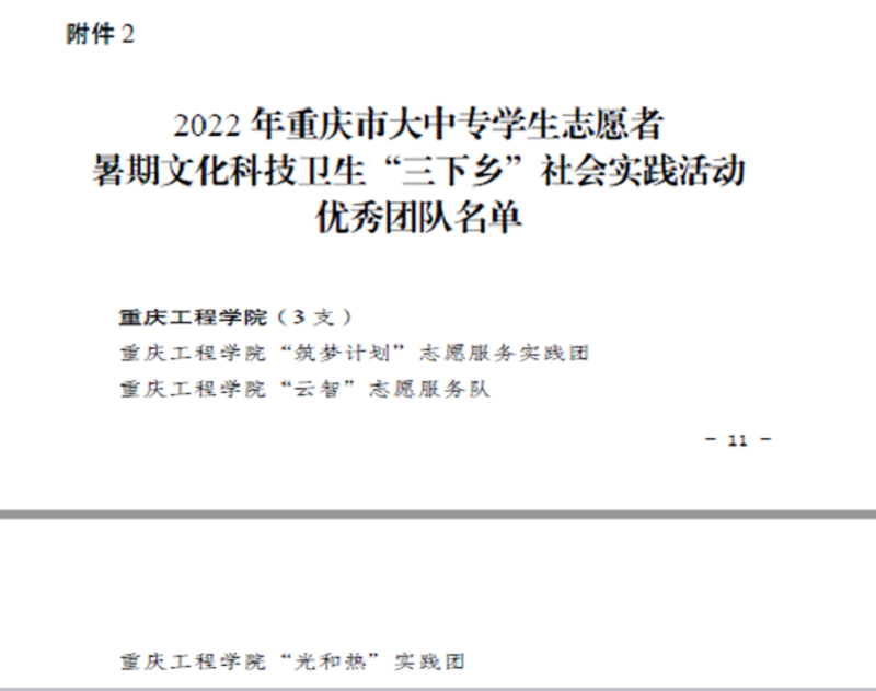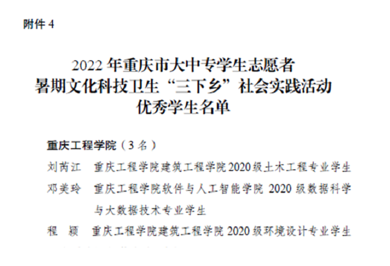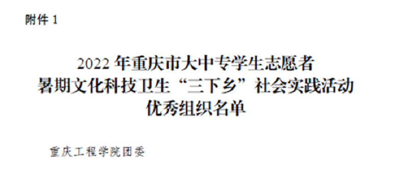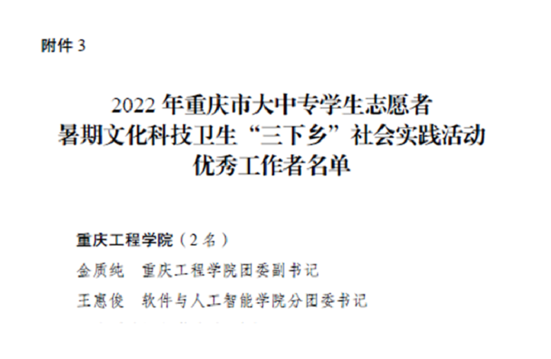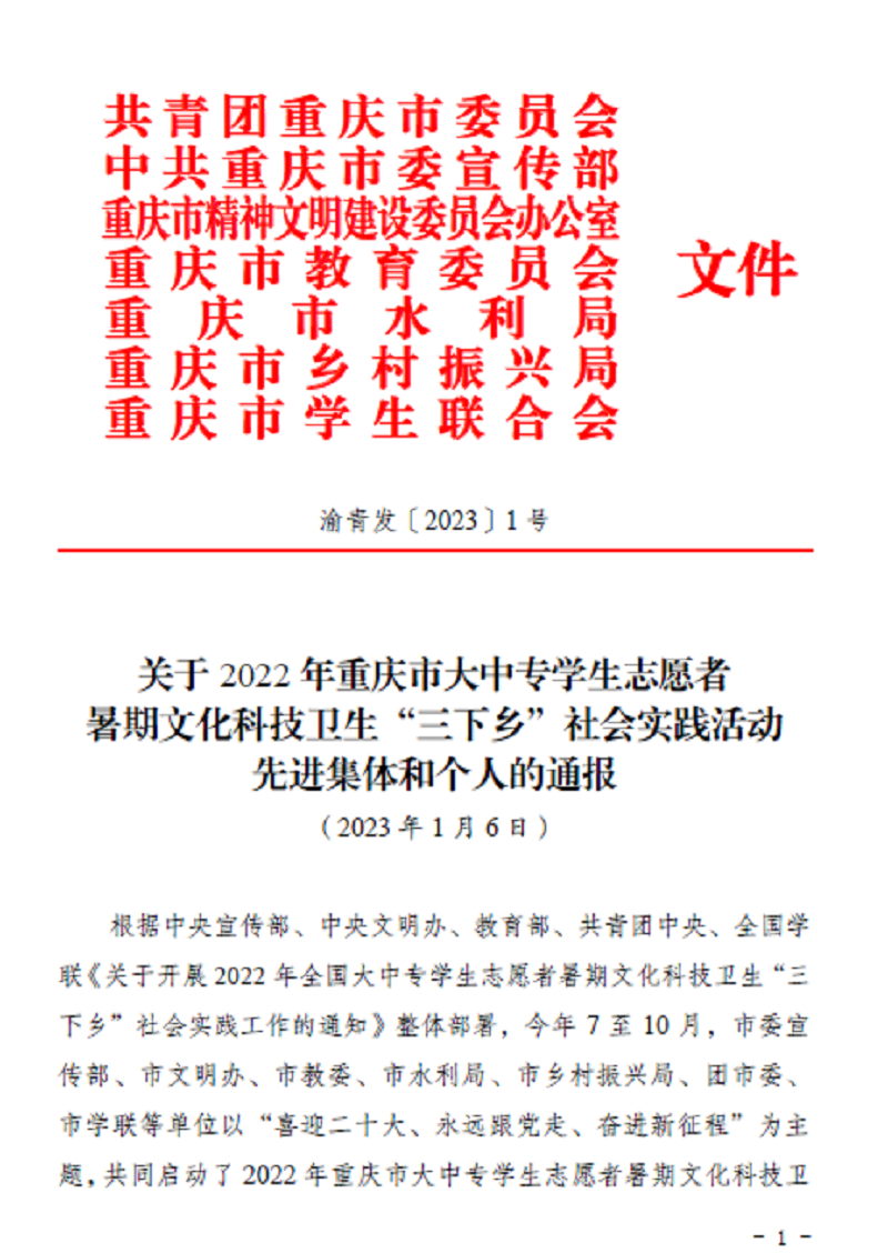 (本网讯 校团委黄涛)近日,市委宣传部、市文明办、市教委、市水利局、市乡村振兴局、团市委、市学联下发《关于2022年重庆市大中专学生志愿者暑期文化科技卫生“三下乡”社会实践活动先进集体和个人的通报》(渝青发〔2023〕1号),决定对54个优秀组织、202支优秀团队、153名优秀工作者、209名优秀学生进行通报表扬。我校团委连续5年被评为重庆市大中专学生志愿者暑期文化科技卫生“三下乡”社会实践活动优秀组织单位, “筑梦计划”志愿服务实践团、“云智”志愿服务队、“光和热”实践团等3支队伍被评为2022年重庆市大中专学生志愿者暑期文化科技卫生“三下乡”社会实践活动优秀团队;金质纯、王惠俊2位老师被评为2022年重庆市大中专学生志愿者暑期文化科技卫生“三下乡”社会实践活动优秀工作者;刘芮江、邓美玲、程颖3位同学被评为2022年重庆市大中专学生志愿者暑期文化科技卫生“三下乡”社会实践活动优秀学生。