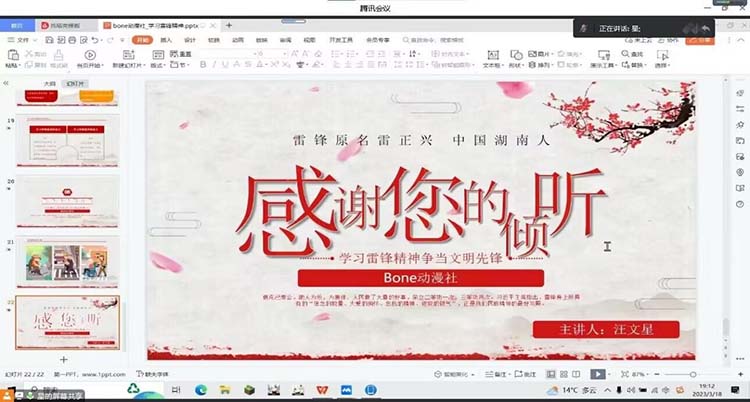 重庆工程学院Bone动漫社为深入学习贯彻习近平总书记对深入开展学雷锋活作出的重要指示精神,于2023年3月18日晚7:00-8:30特别举办了这次线上“雷锋精神”宣讲活动,以加深学生对雷锋精神的理解,深刻把握雷锋精神的时代内涵。