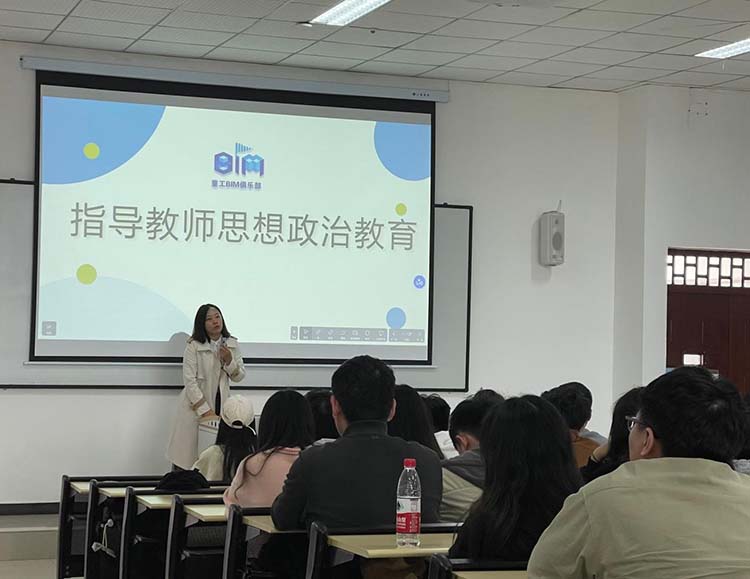 会上,指导老师安雪玮进行思想政治教育,围绕二十大报告,详细讲述了现如今国内建筑业的发展情况, 以及数字化建筑的发展方向,呼吁社团会员们应当积极参与社团活动,抱着求学的想法在社团的活动中不断提升自我,同时也倡导社团成员们应当发挥重工精神,攻坚克难无私奉献,在社团内部应当打造互相学习的品格。