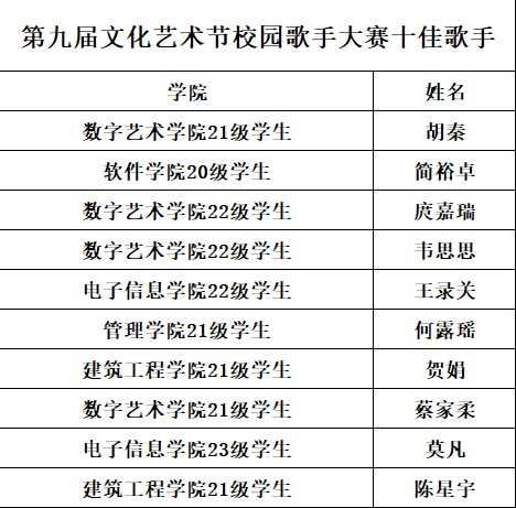 (本网讯 图/文 张俊)为丰富校园文化生活,推动校园精神文明建设,营造积极向上的校园文化氛围,彰显时代精神,激发青春活力。10月20日19:00,由校团委主办,管理学院承办的第九届文化艺术节校园歌手大赛总决赛在我校南泉校区学术报告厅成功落幕。本次歌手大赛历时近半个月,经两校区初赛、半决赛重重选拔,最终19名选手从342名选手中脱颖而出,晋级总决赛,经过两个小时的激烈争夺,最终数字艺术学院胡秦同学获得冠军,软件学院简裕卓同学获得亚军,数字艺术学院庹嘉瑞同学获得季军。