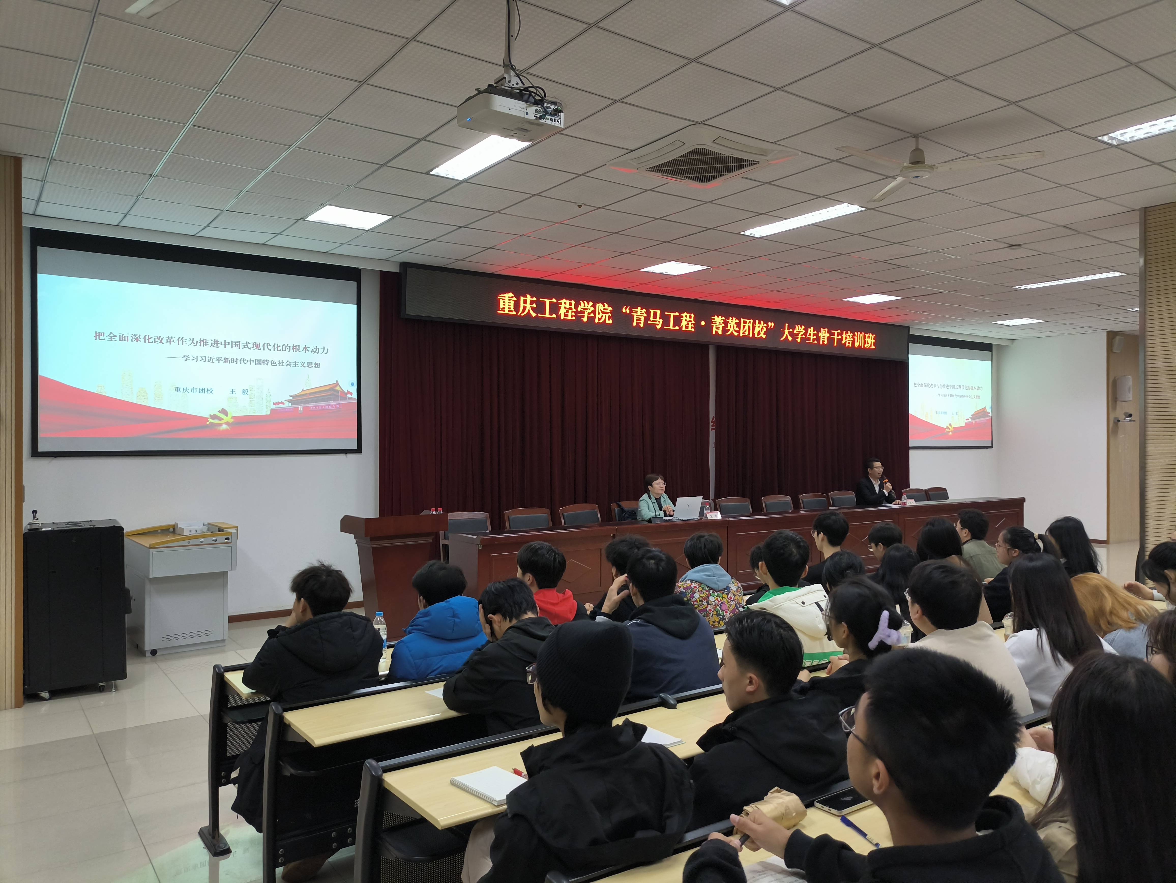 (本网讯 图/文 张俊)为进一步学习贯彻习近平新时代中国特色社会主义思想和党的二十大精神,提高青年学子的政治理论素养,11月29日14:30,我校于教学楼6302开展了重庆工程学院“青马工程·菁英团校”大学生骨干培训班。本次培训班特别邀请现任重庆市团校党委委员、副校长,团中央“青年讲师团”成员王毅副教授主讲,各年级青马工程学员、团学骨干等共400余人参与培训。