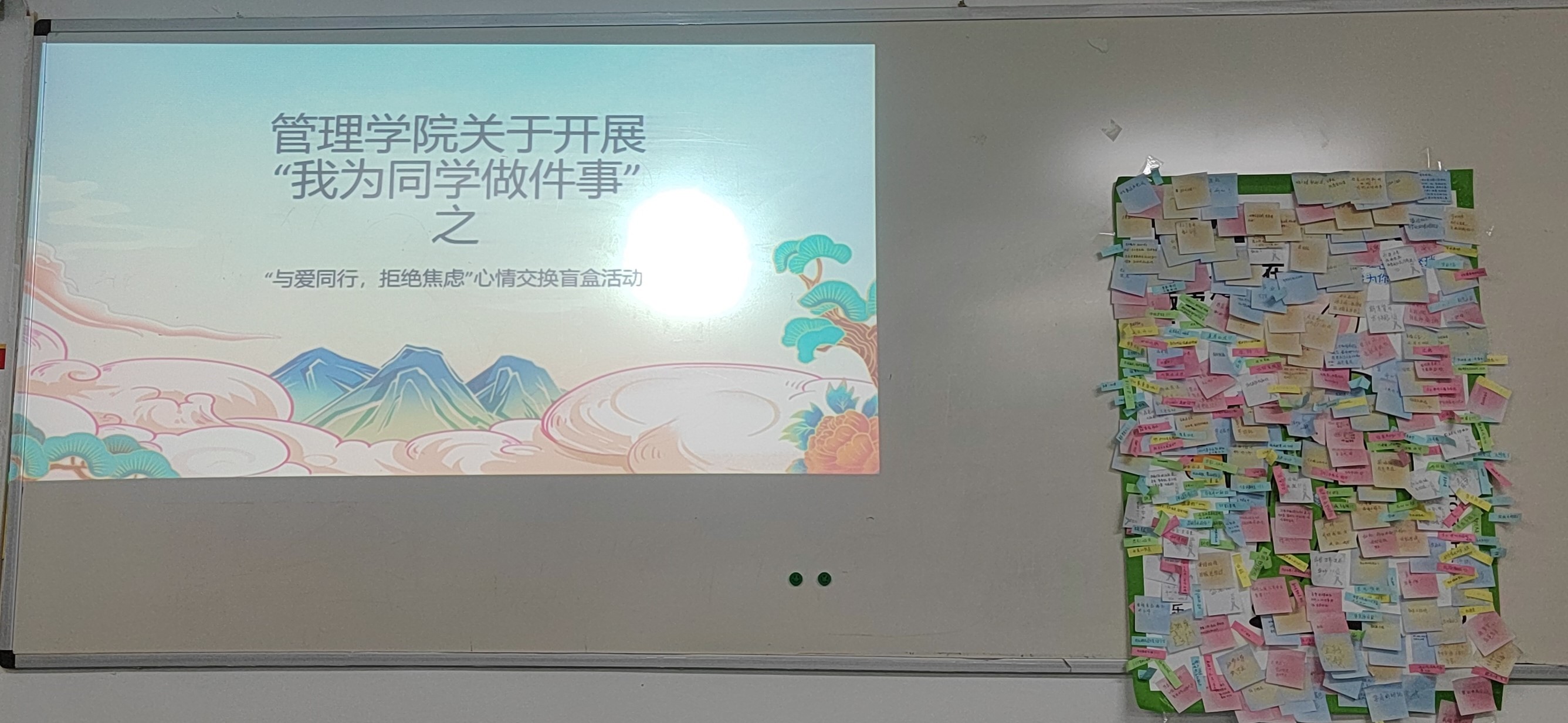 本网讯(文/童言言 图/徐春玲)“智者千虑,必有一失。遇者千虑,必有一得。”随着社会的飞速发展、知识技术的革新、生活节奏的加快,近年来,大学生的心理压力越来越大,心理健康成了突出问题。为了缓解同学们的压力,给他们提供一个倾诉平台,我院于2023年11月25至26日开展“我为同学做件事”之“与爱同行,拒绝焦虑”心情交换盲盒活动。