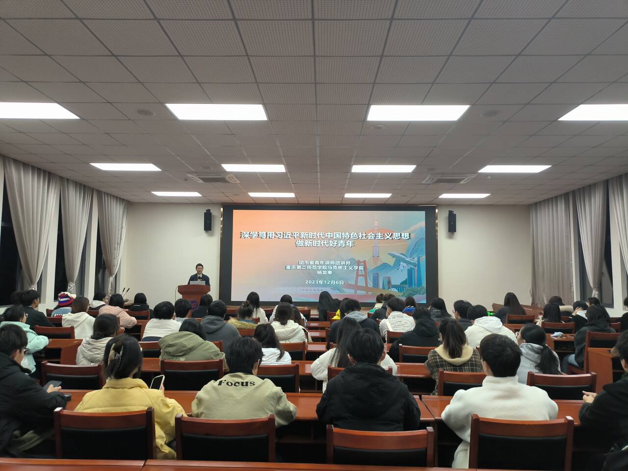 (本网讯 图/文 张俊)为深入学习贯彻习近平新时代中国特色社会主义思想,引导青年全面、系统、准确把握好时代责任与担当,提高广大学生骨干思想觉悟,2023年12月6日晚,我校团委在行政楼201开展“青马工程·菁英团校”学生骨干培训。本次培训由团市委青年讲师团成员、重庆第二师范学院马克思主义学院教师杨龙奉主讲,学生党员、团学骨干以及2023年新发展团员等120余人共同参与。