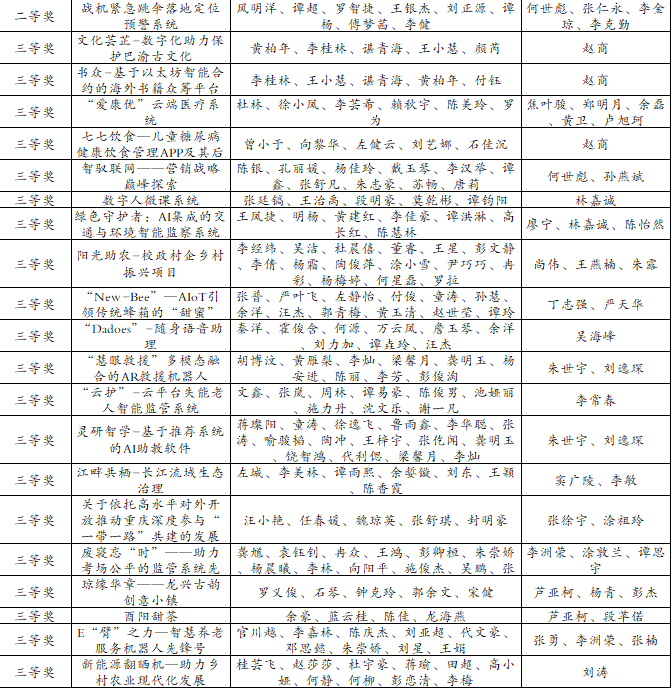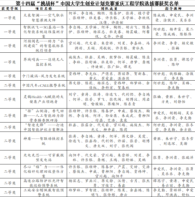 按照团市委、市教委等《关于组织开展第十四届“挑战杯”中国大学生创业计划竞赛重庆市选拔赛的通知》(渝青发[2024]45号)文件精神,根据学校《关于组织开展第十四届“挑战杯”中国大学生创业计划竞赛重庆工程学院选拔赛的通知》等文件要求,经各学院积极组织动员,学生自愿报名参与,校团委邀请校内外专家组评审,最终共评选出35件优秀作品(一等奖5名、二等奖10名、三等奖20名),现将获奖名单予以公示(荣获一、二等奖的作品将被推报参加市赛)。