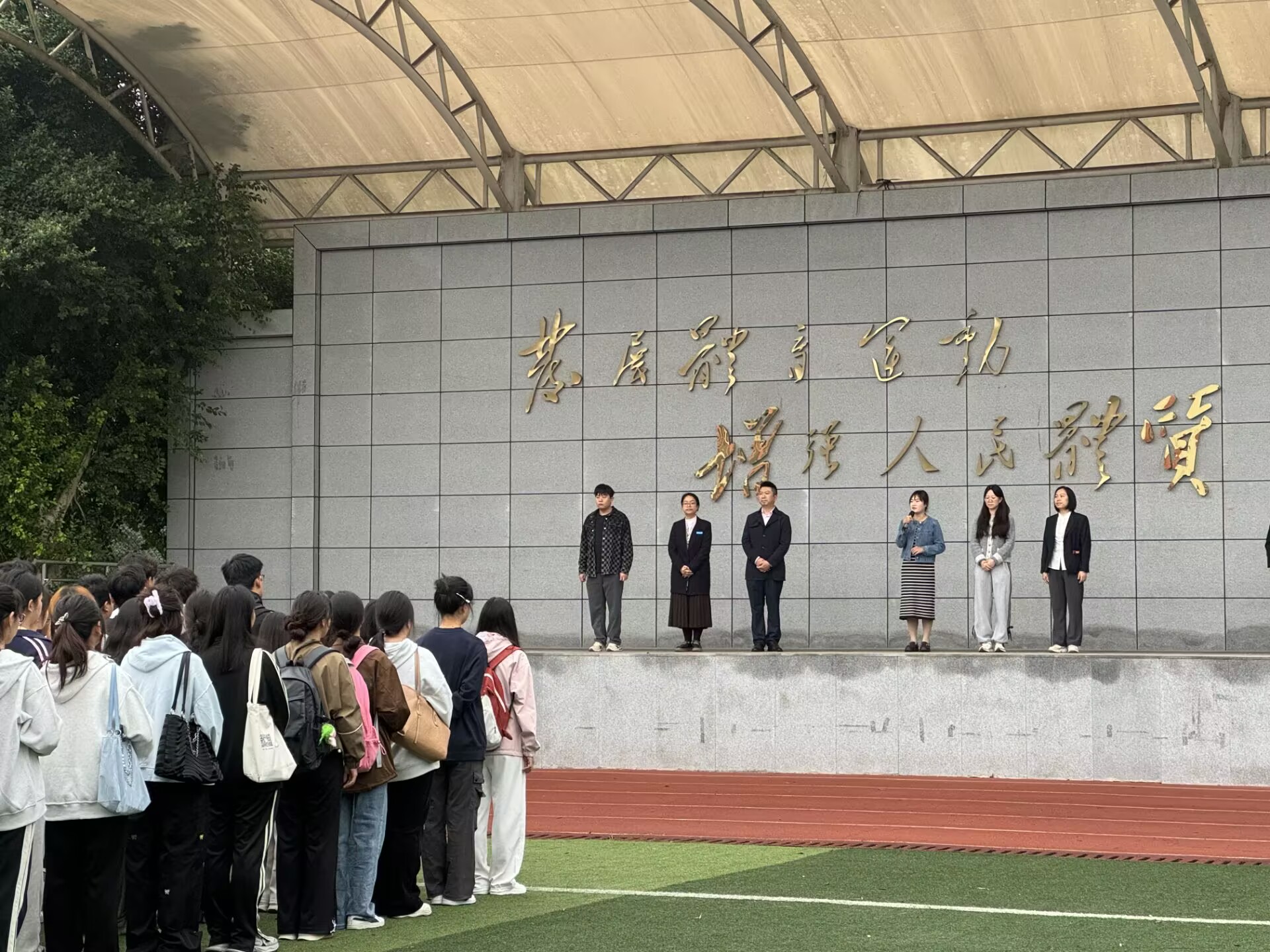当雄壮的国歌奏响,五星红旗迎风飘扬。全体师生肃立,行注目礼,高唱国歌。紧接着,优秀学生代表郑棣榔结合个人经历,鼓励同学们以实践的方式反思学习的理论、再以学到的理论促进实践,勇于面对挑战,善于总结经验。