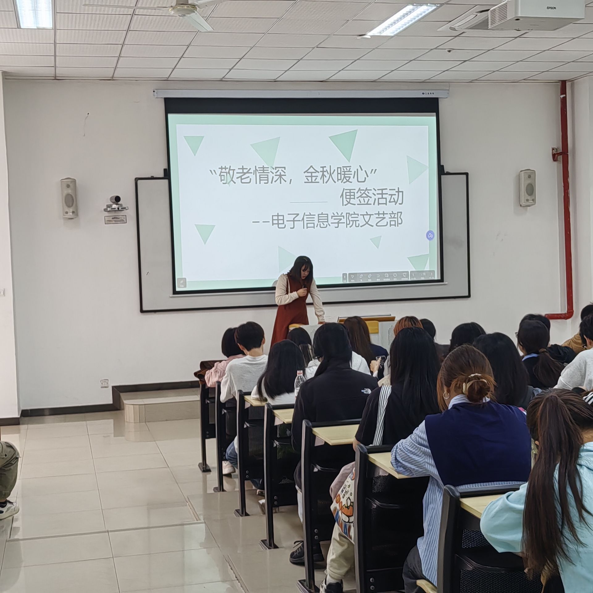 为了让同学们感受中华传统美德的魅力,增强尊老敬老的社会责任感,电子信息学院文艺部于2024年10月25日13:00—14:30开展“敬老深情,金秋暖心。”主题活动。