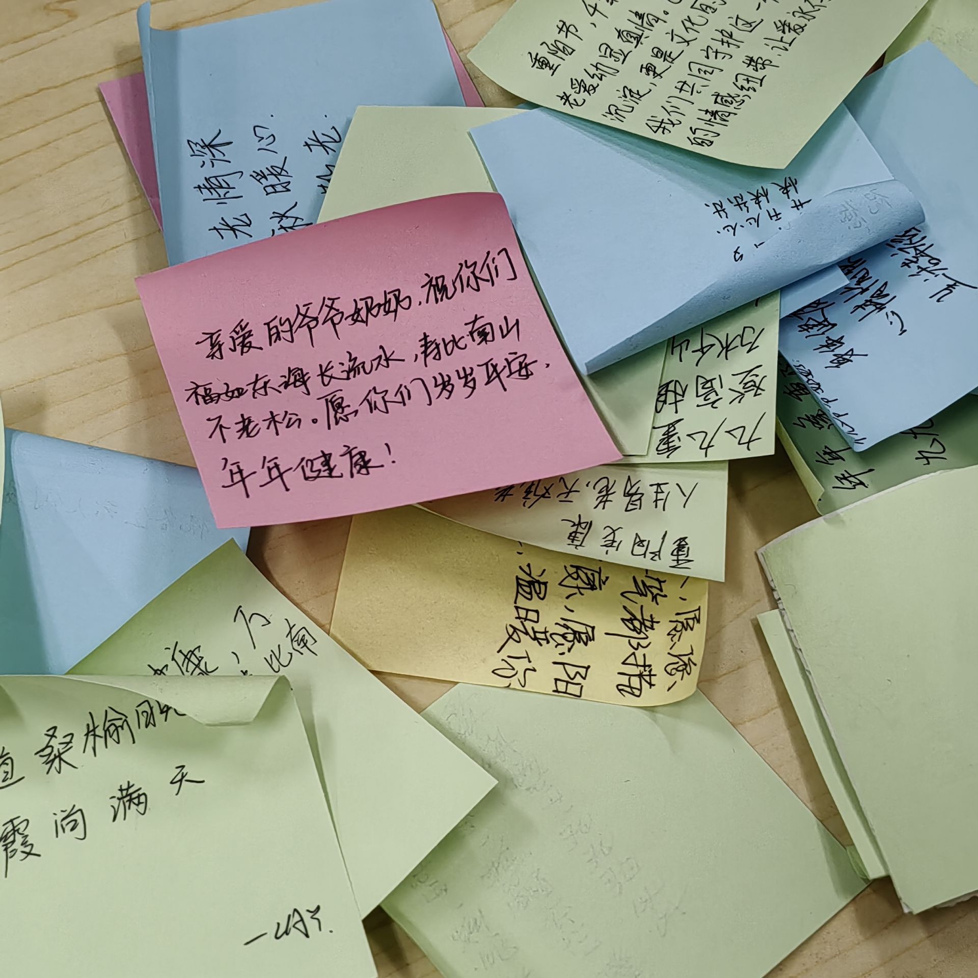 本次活动由电子信息学院文艺部举办,活动过程中,同学们用笔将祝福写在便利签上,并上传收集表。同学们用文字表达自己最纯粹的关爱,他们用自己的方式展现着当代大学生敬老爱老的美德。简短的文字中流露的是句句真情的关心与祝愿。