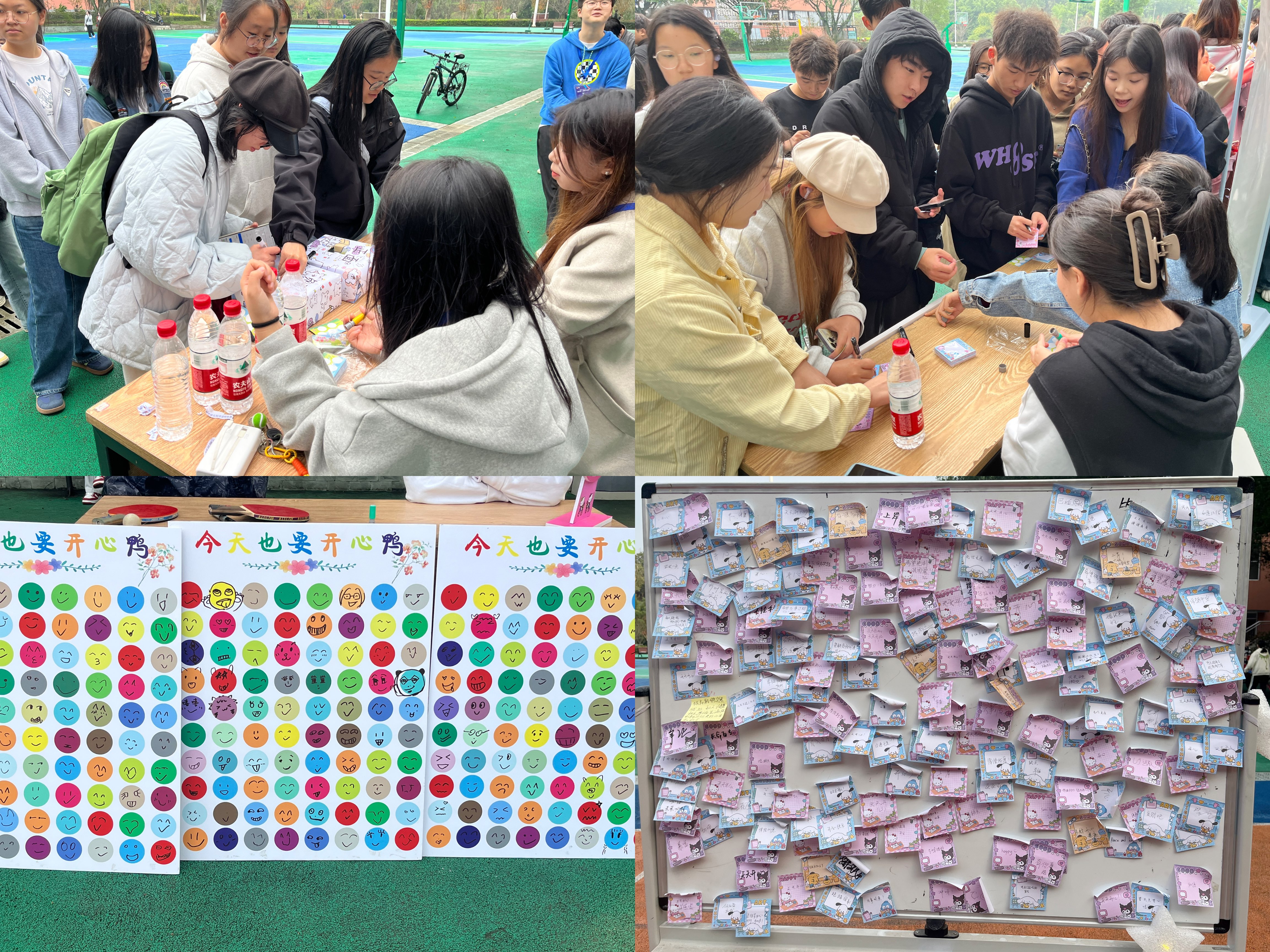为确保活动的顺利进行,各部门成员提前半小时到活动场地进行准备。活动开始,同学们陆续来到现场,此次活动设有“情绪回收站”,“情绪卡片”,“心语心愿”等多个有趣的心理活动。在“情绪回收站”,同学们认真地书写便签,分享自己的负面情绪,传递温暖的正面故事,在交换间感受情绪的碰撞与慰藉;“情绪卡片”处充满了欢声笑语,同学们通过转动转盘,根据不同的情绪词汇分享或开心、或难过的故事,拉近了彼此的距离;在“心语心愿”的展板上,五颜六色的便利贴承载着同学们美好的憧憬和心底的秘密,大家在书写中憧憬未来。