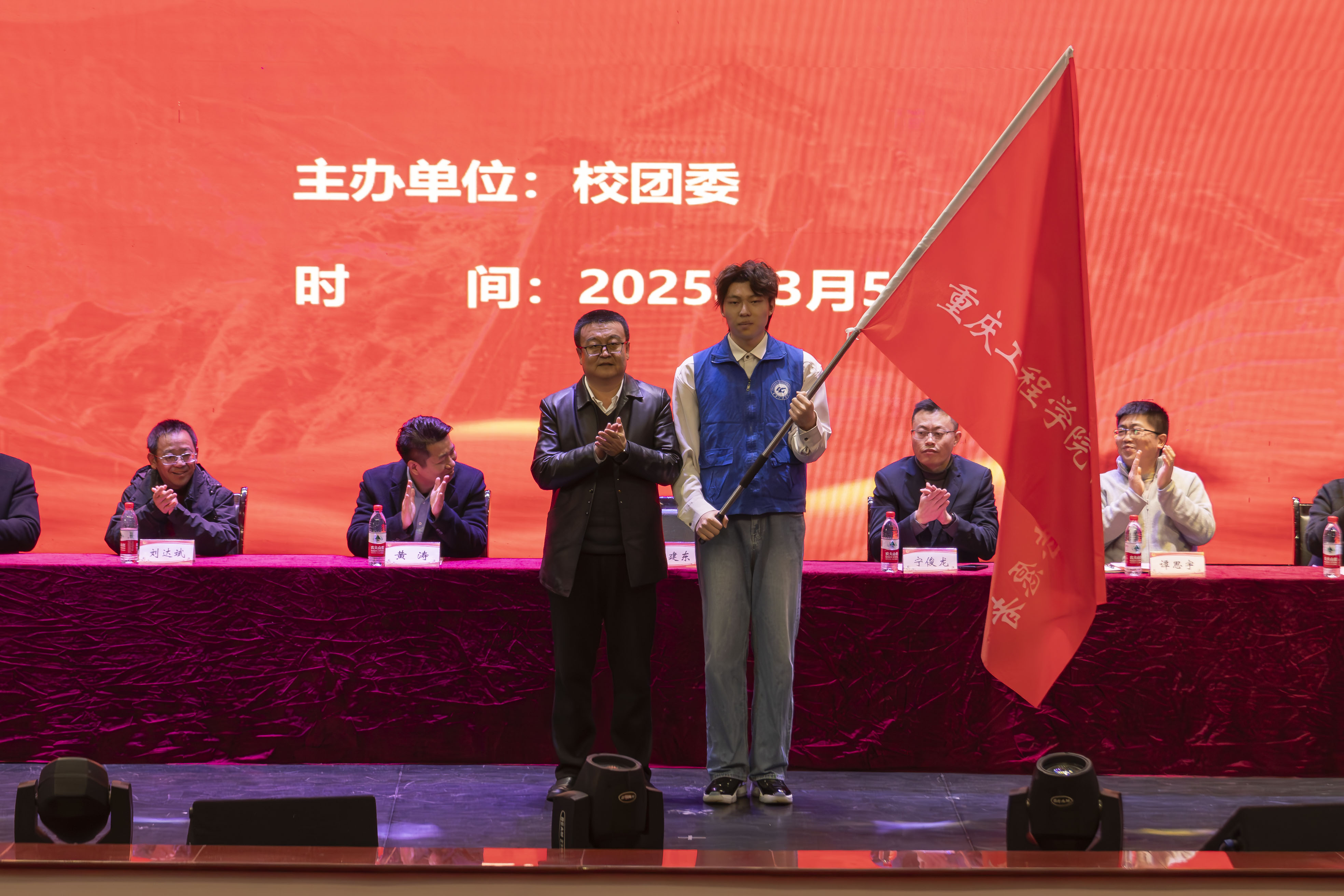 紧接着,副校长王建东在讲话中充分肯定了过去一年学校志愿服务的丰硕成果,并对同学们提出三点希望:一是希望同学们读懂雷锋密码,要以红岩精神的"忠诚为民"为信仰旗帜,以雷锋精神"无私奉献"为行动标杆,让红岩与雷锋的“信念同频”;二是希望同学们践行青春誓言,落实从“思想铸魂”到“行动赋能”的转变;。三是希望同学们奋力书写时代答卷,让“热血”与“大爱”同频共振,用“强国有我”的青春宣言诠释雷锋与红岩精神的时代伟力。仪式最后,王校长为志愿者代表授旗标志着我校2025年“学雷锋”志愿服务月正式启动。