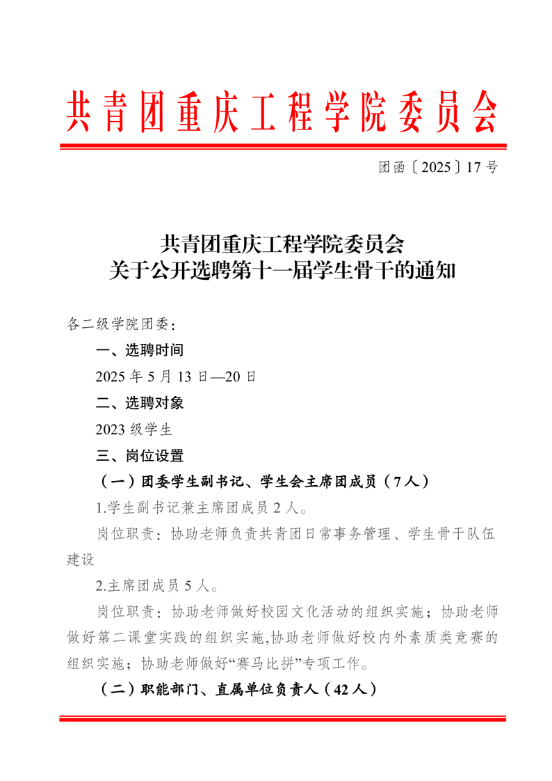共青团重庆工程学院委员会关于公开选聘第十一届学生骨干的通知