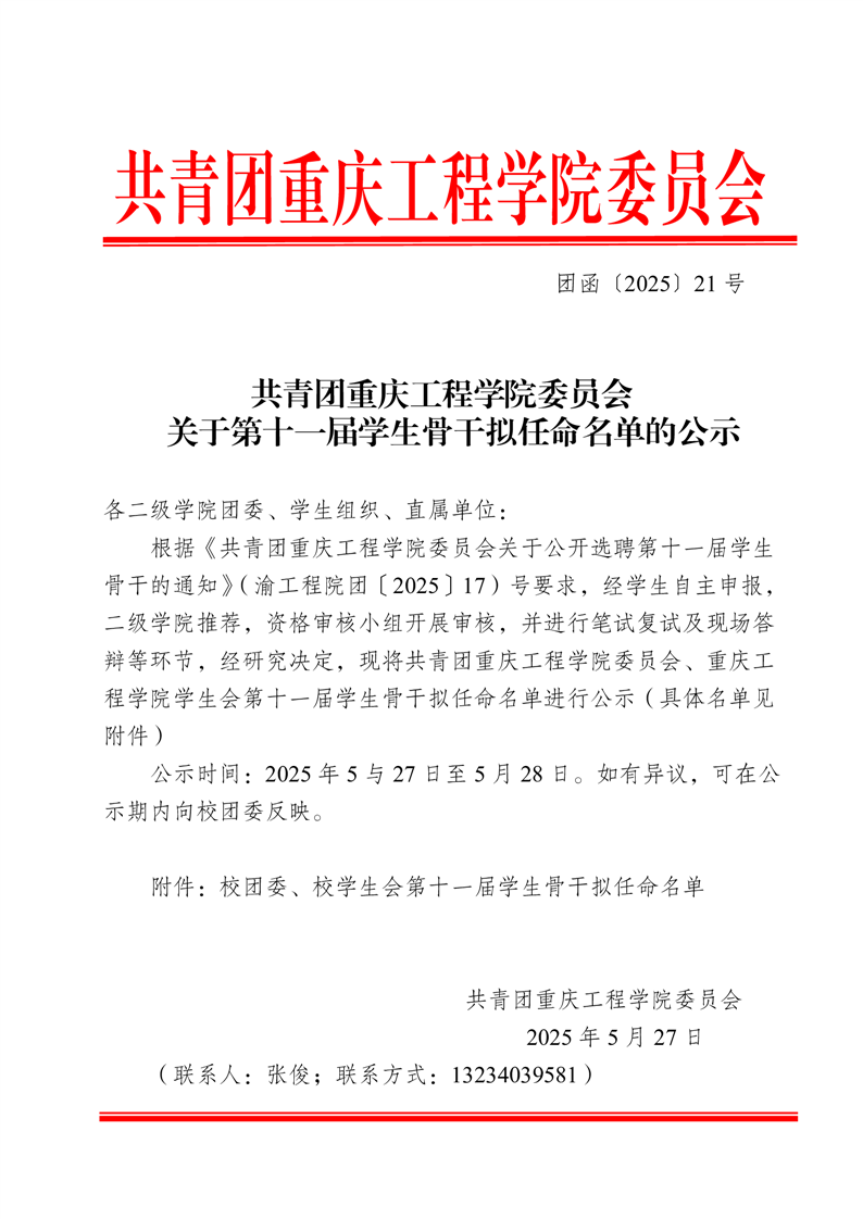 共青团重庆工程学院委员会关于第十一届学生骨干拟任命名单公示